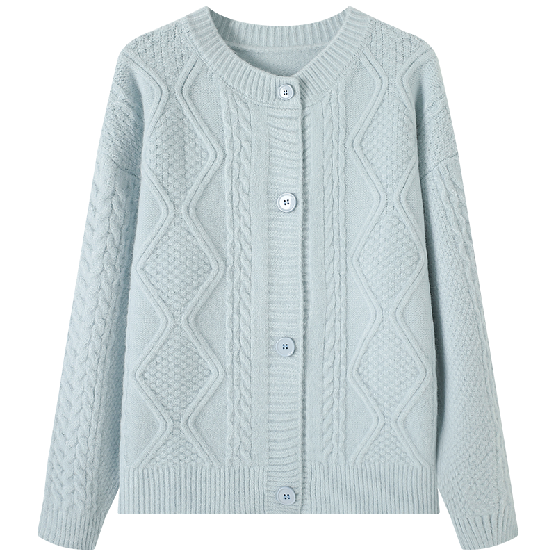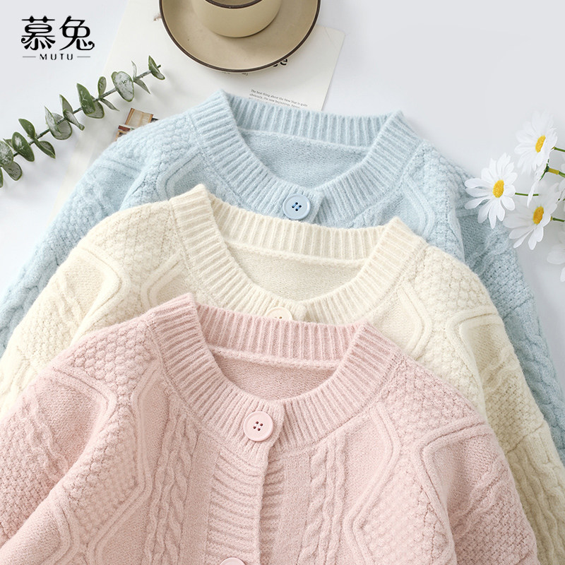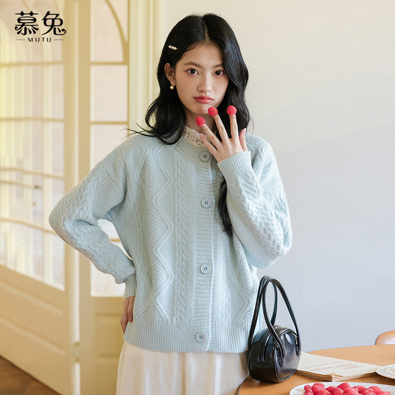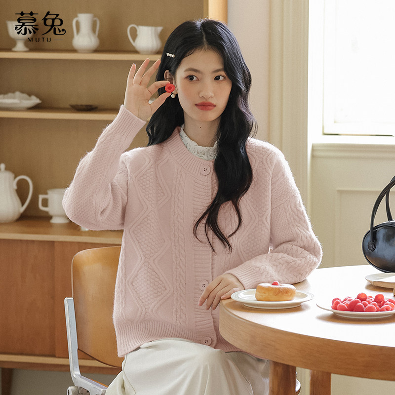 慕兔圆领麻花针织毛衣开衫