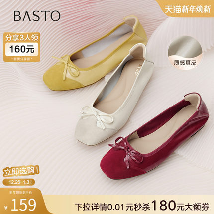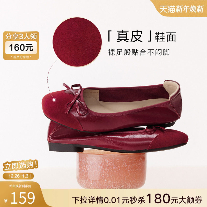 百思图2025秋季新款牛皮红色浅口单鞋蝴蝶结通勤船鞋女鞋C2201CQ5