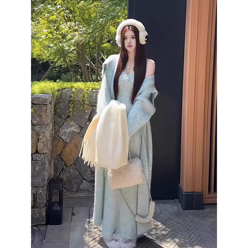 巨好看的韩系早秋穿搭一整套中长款毛衣开衫连衣裙子两件套装
