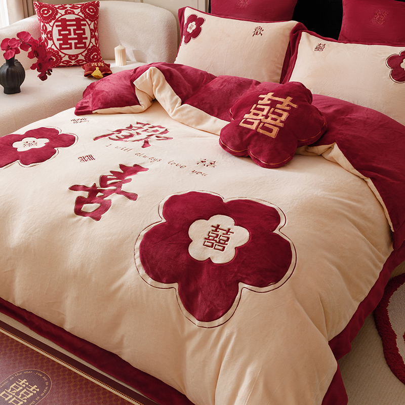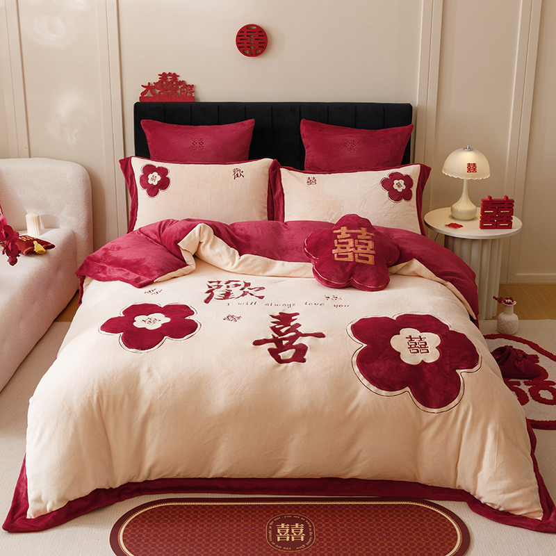 坤花加厚保暖牛奶绒刺绣结婚套件