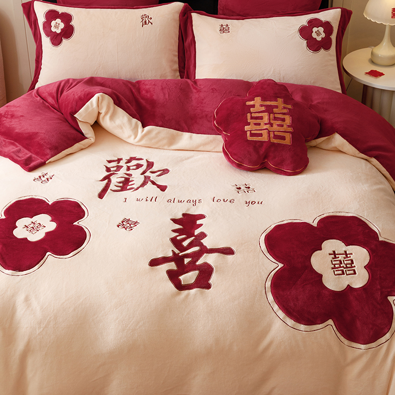 秋冬季牛奶绒婚庆四件套加厚保暖珊瑚绒被套红色绣花结婚床上用品