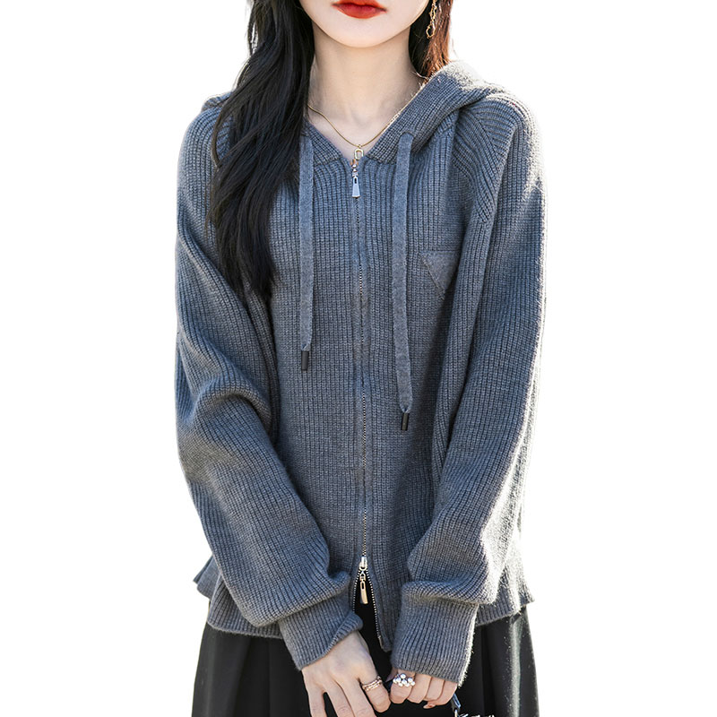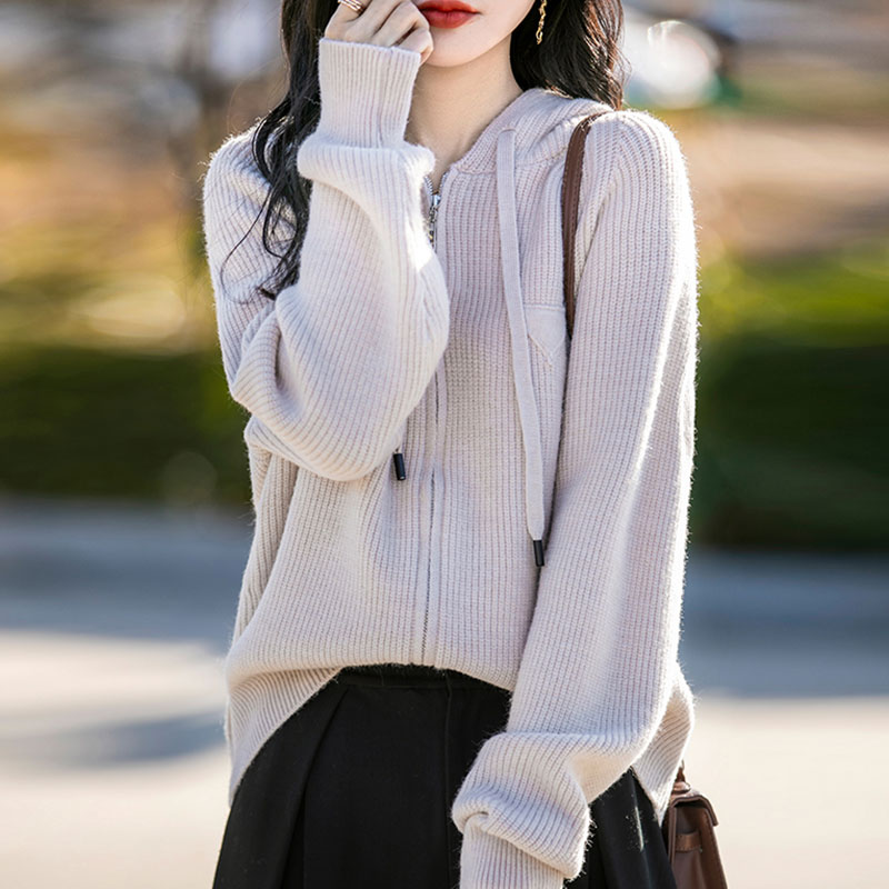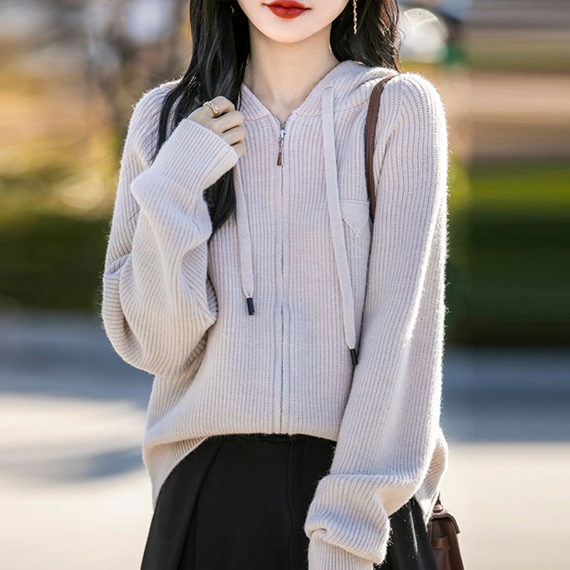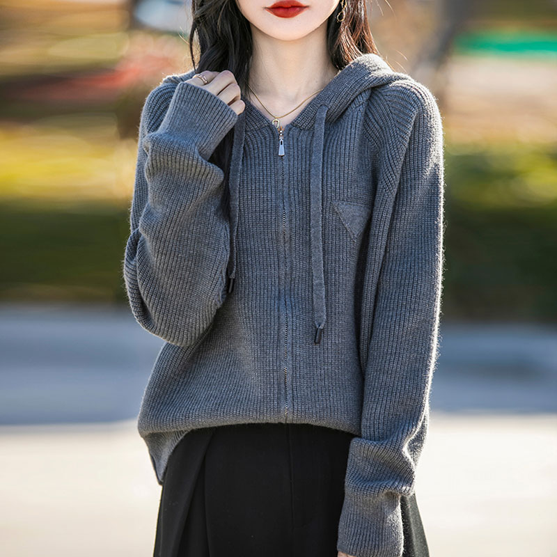 春秋新款连帽女士毛衣针织开衫外套女纯色时尚宽松短款外搭上衣