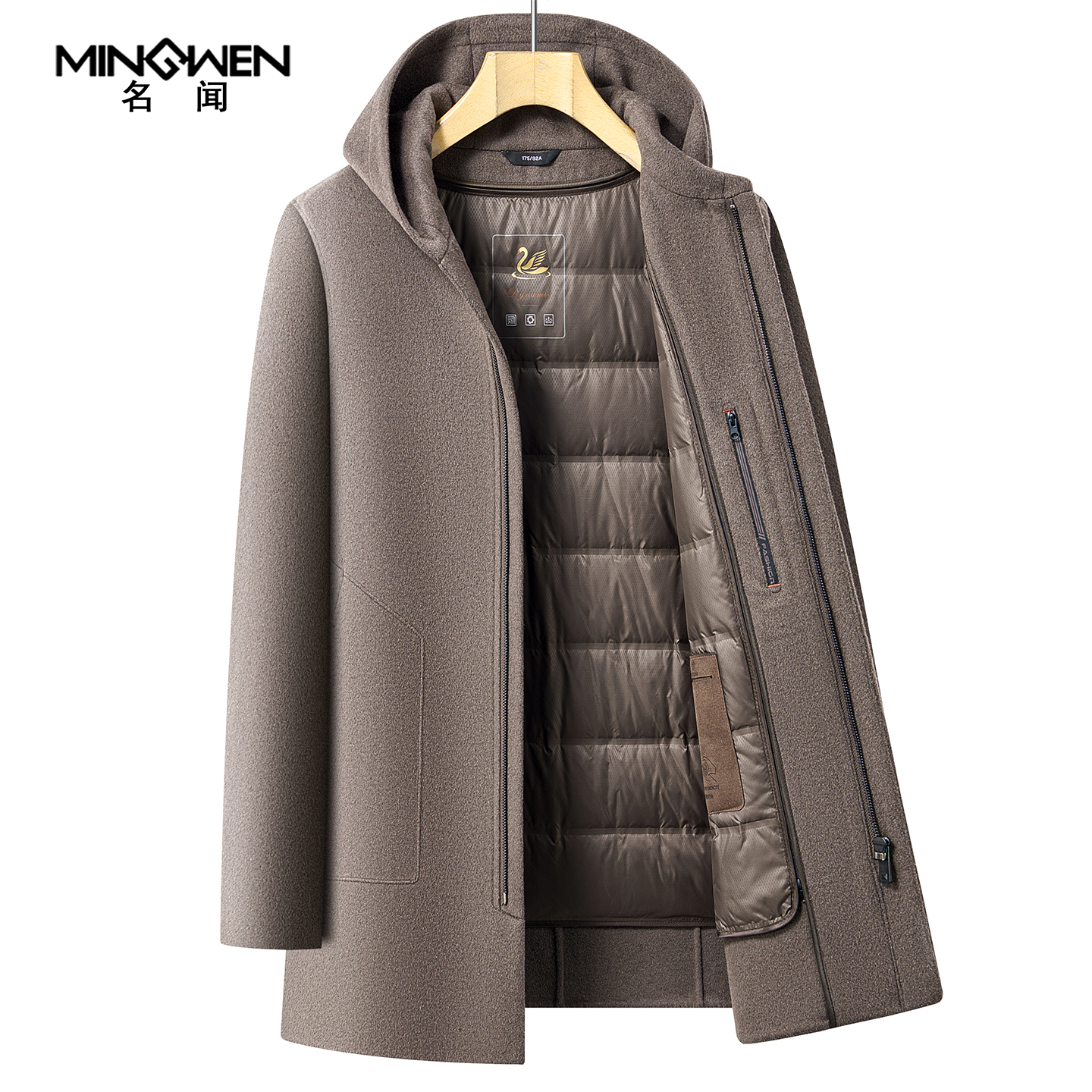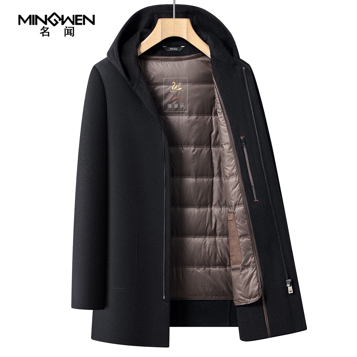 连帽羊毛双面呢大衣男冬季加厚中长款高级感痞帅羽绒内胆风衣外套