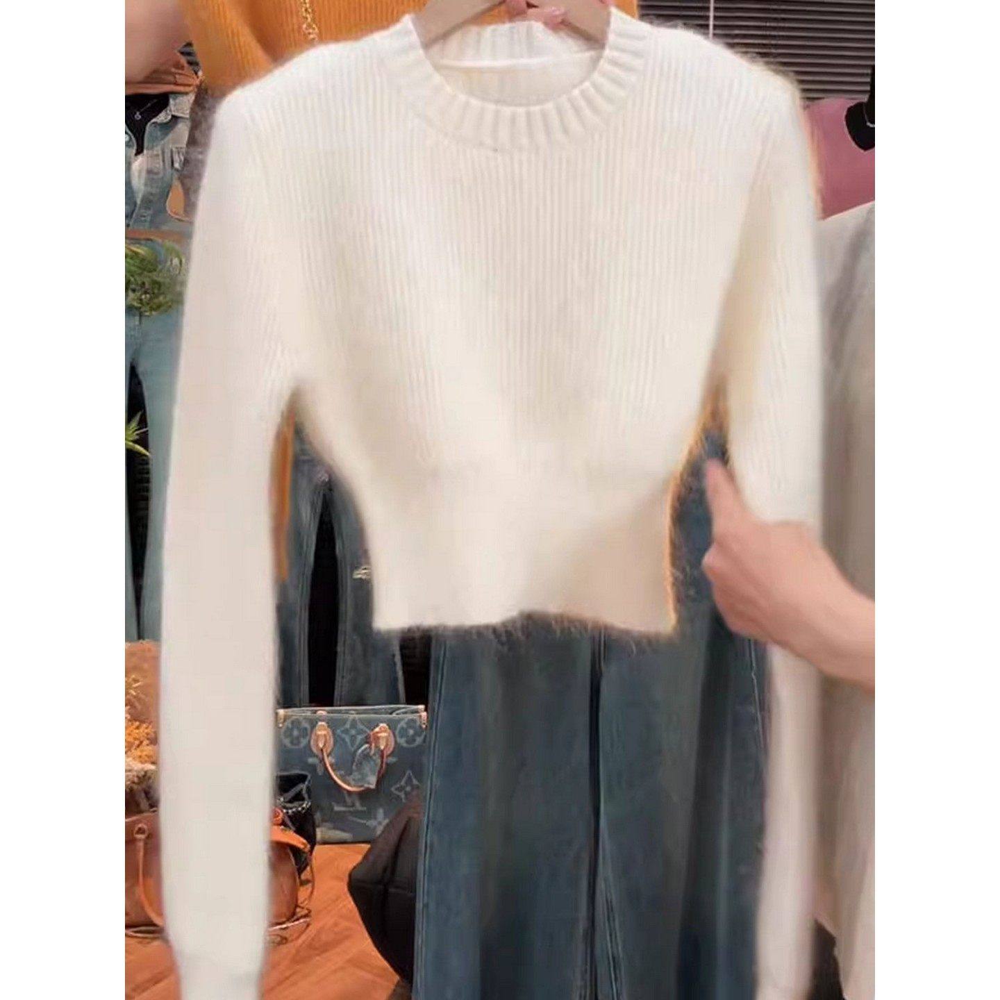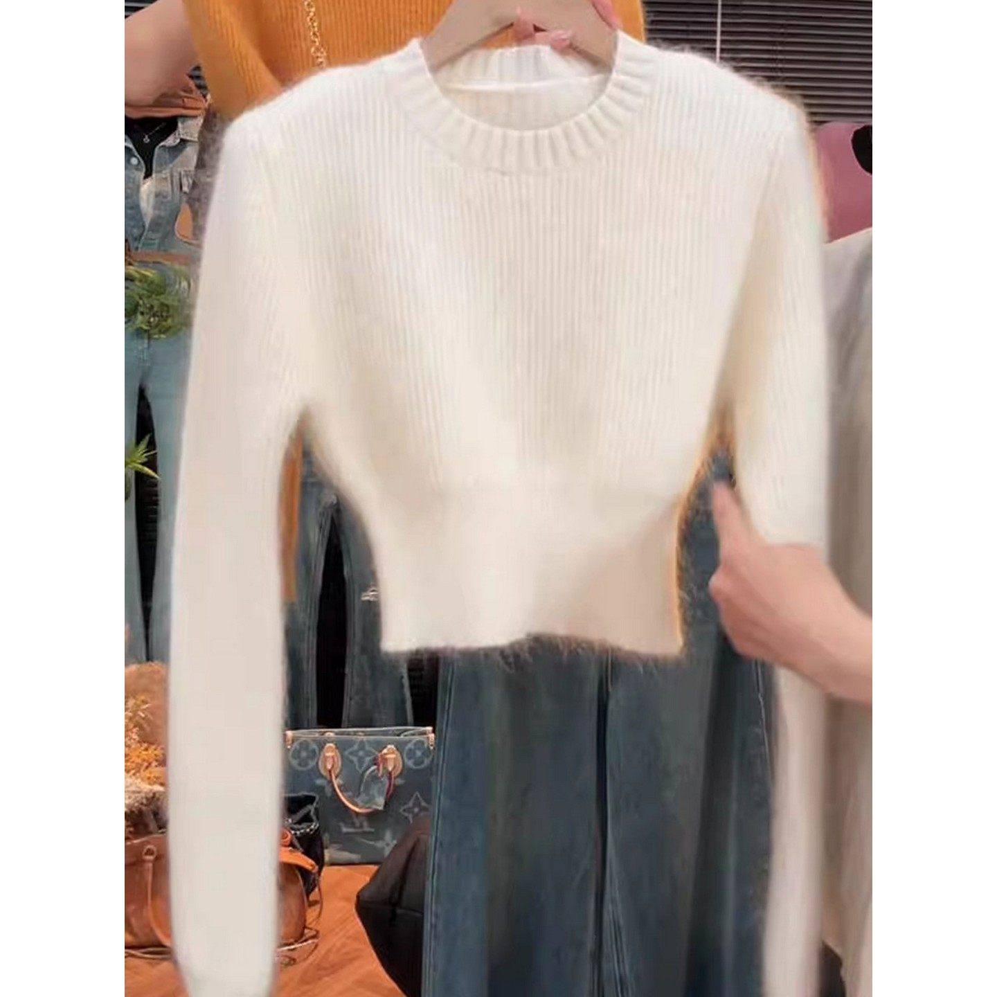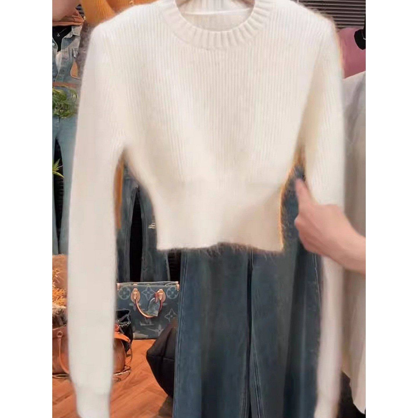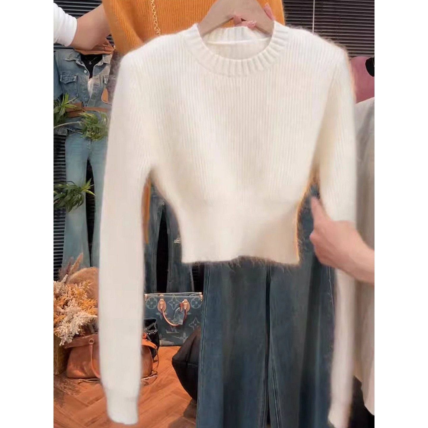 大码胖MM白色圆领套头长袖毛衣女秋冬百搭修身显瘦软糯针织短上衣