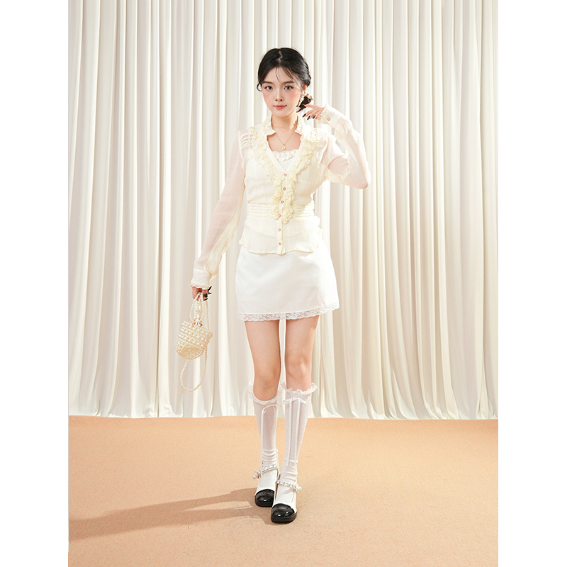 塞纳假日 荷叶边拼接雪纺衫褶皱立领长袖衬衫+花边拼接半身裙套装