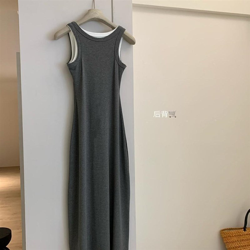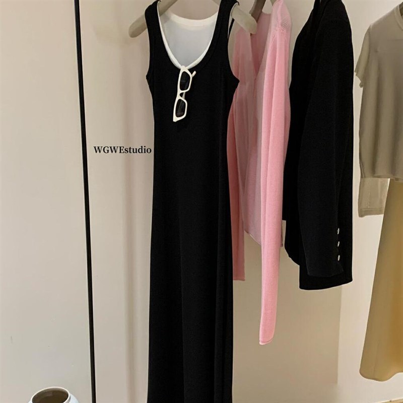 假两件撞色针织背心吊带连衣裙女春夏季修身内搭打底显瘦长款裙子