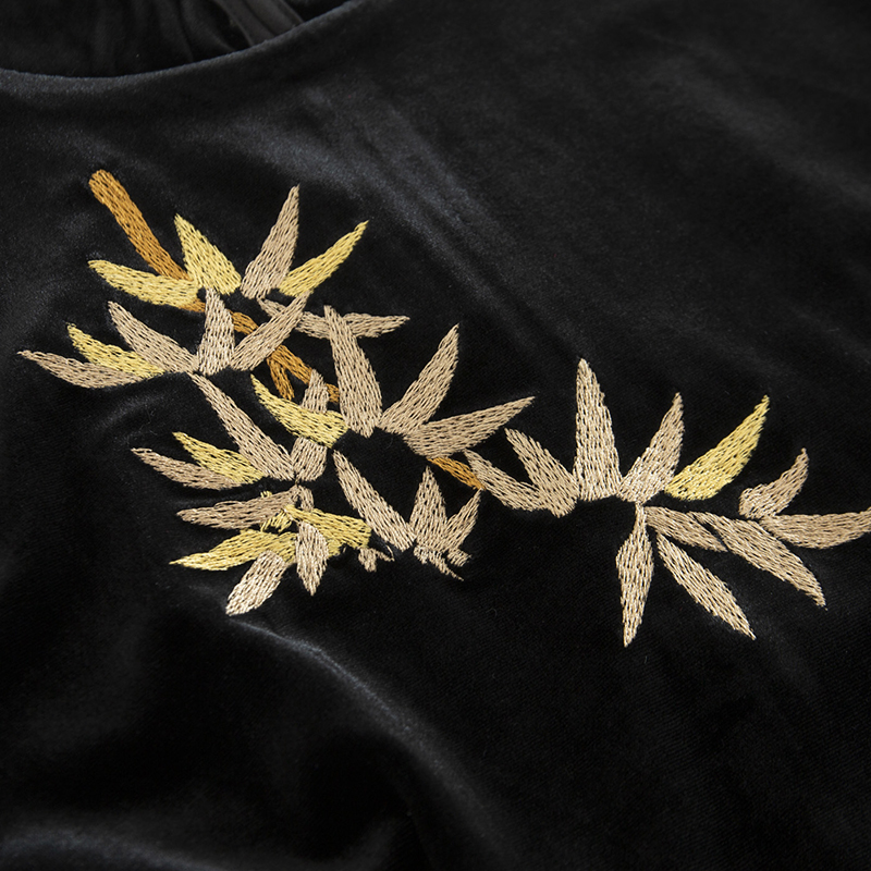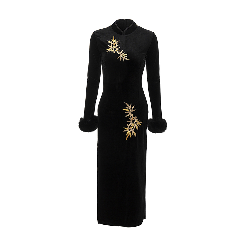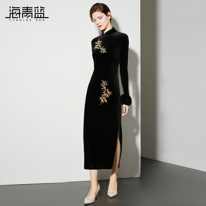 海青蓝复古新中式国风竹子刺绣旗袍裙子2025秋冬季新款丝绒连衣裙