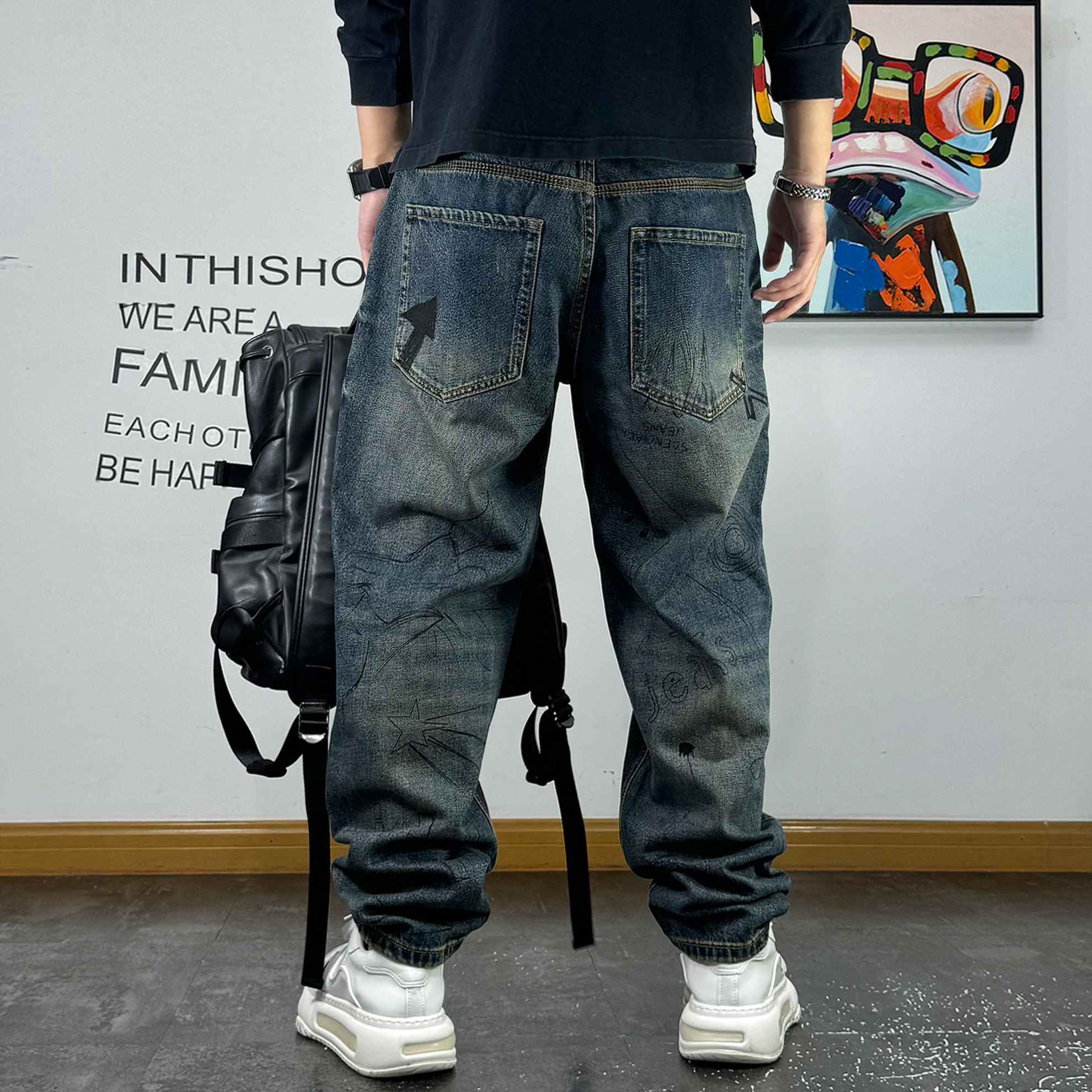 潮牌宽松小直脚怀旧复古牛仔裤男秋款字母印花青年百搭休闲九分裤