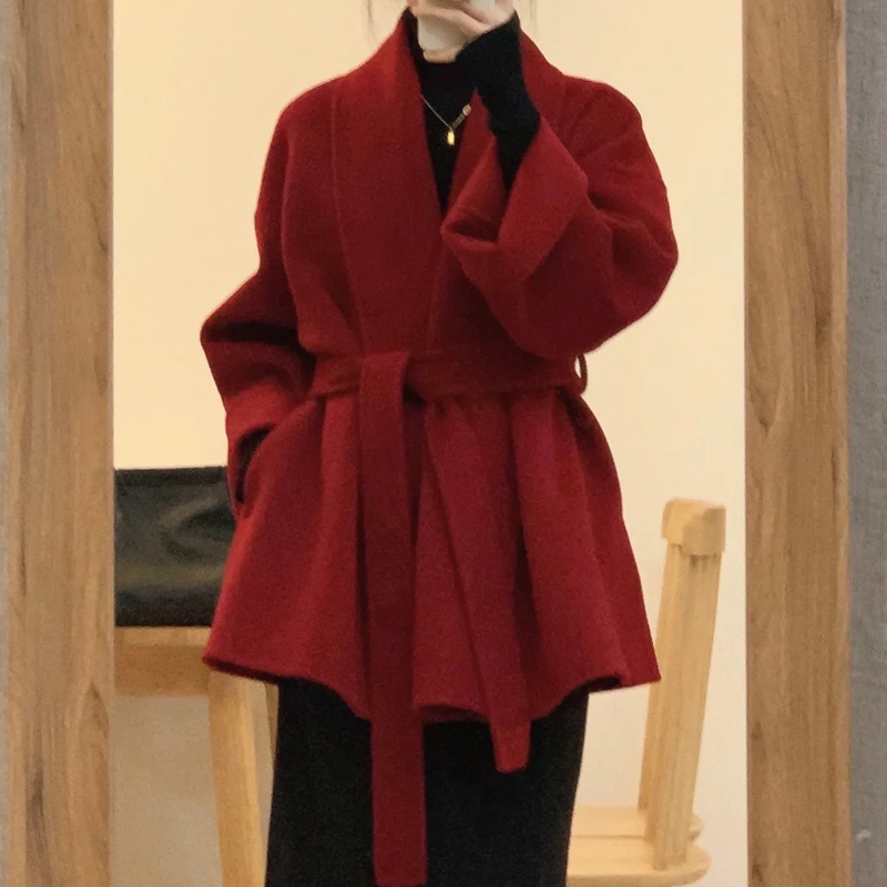 红色双面羊绒大衣女短款2025秋冬季高级感复古小个子毛呢外套结婚