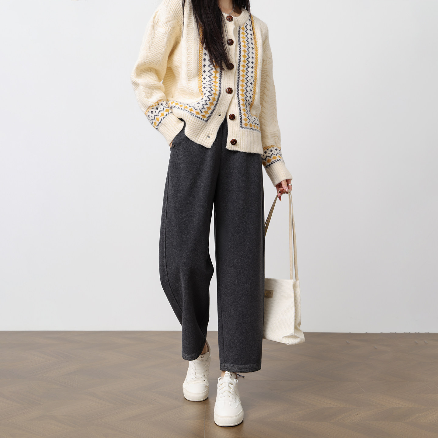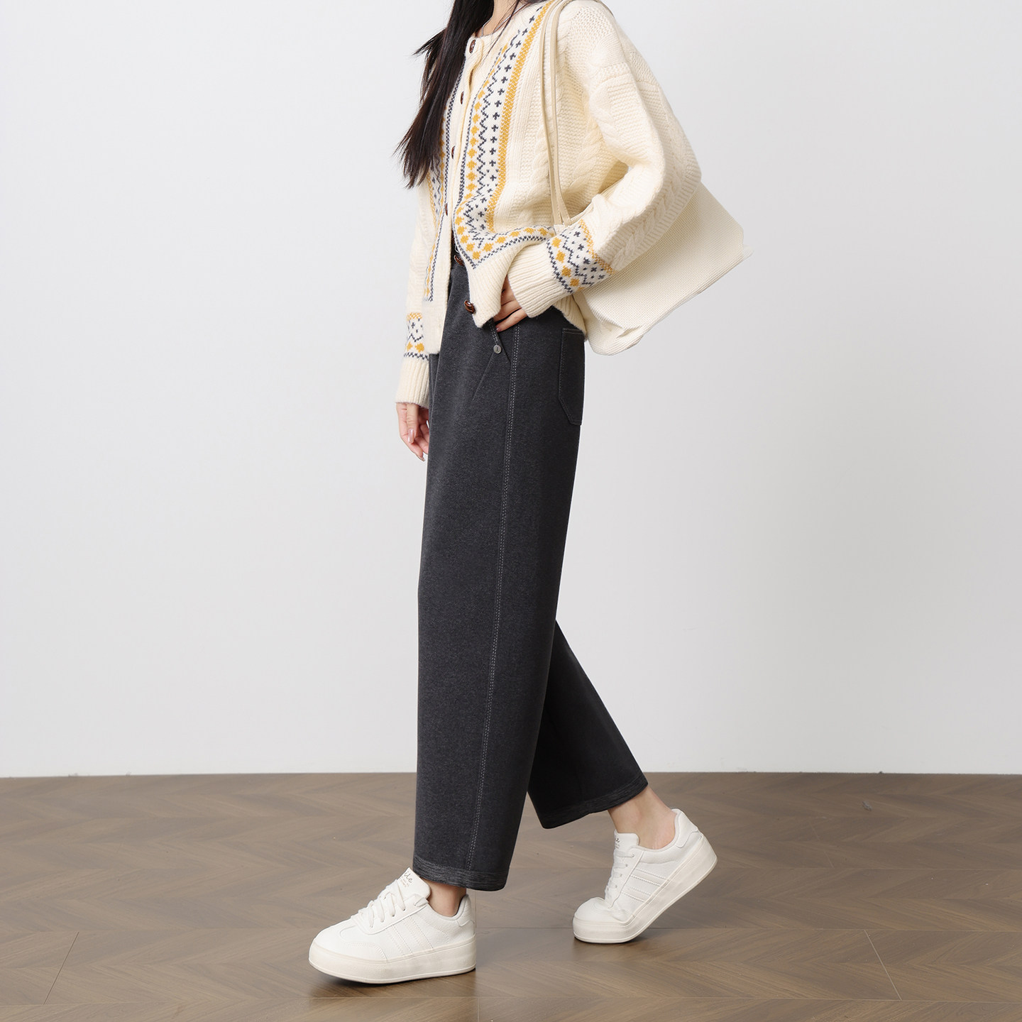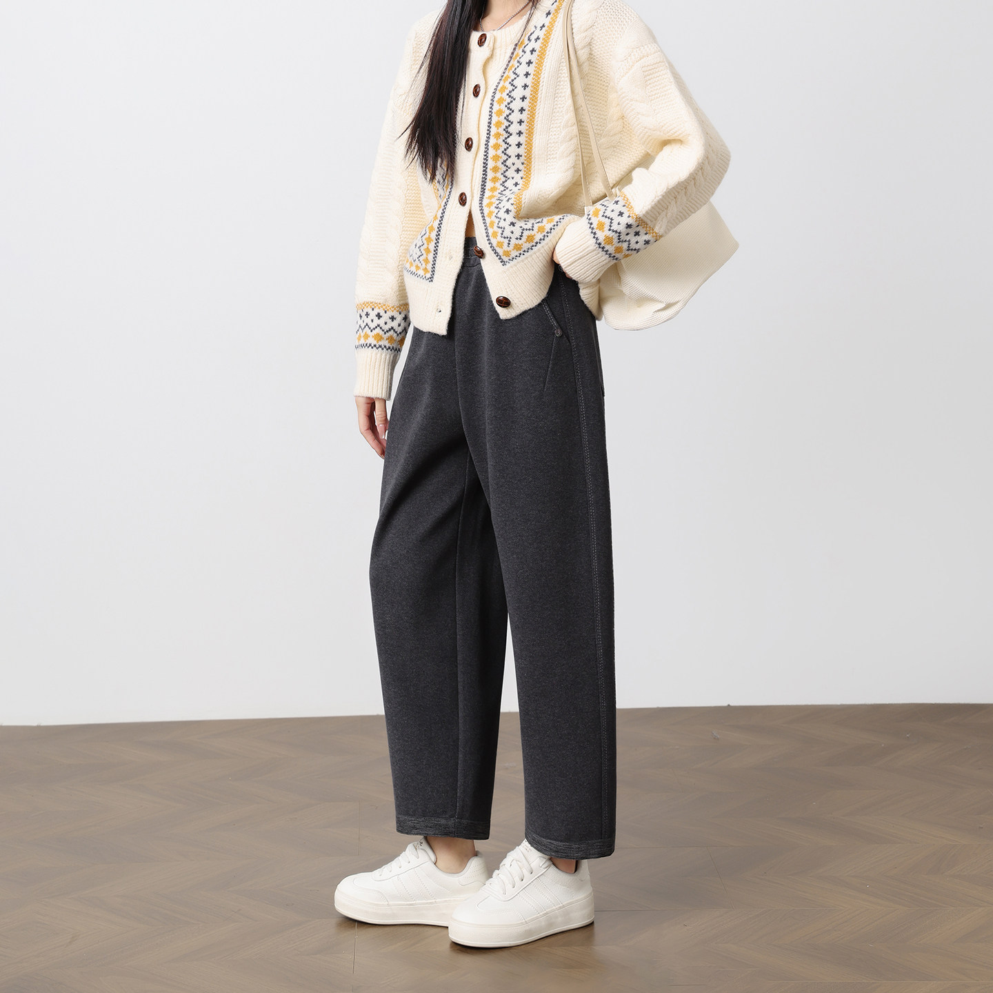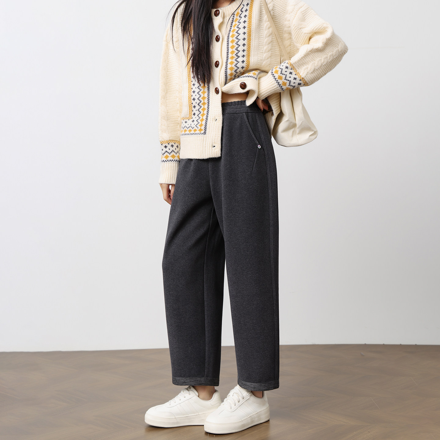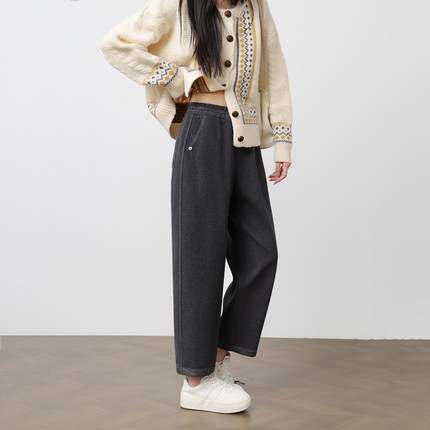 秋冬新款小个子灰色九分毛呢奶奶裤女高腰宽松阔腿加厚休闲萝卜裤