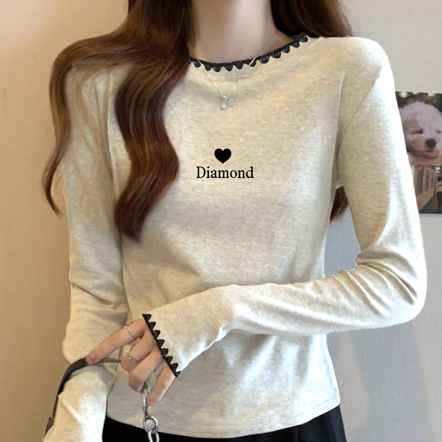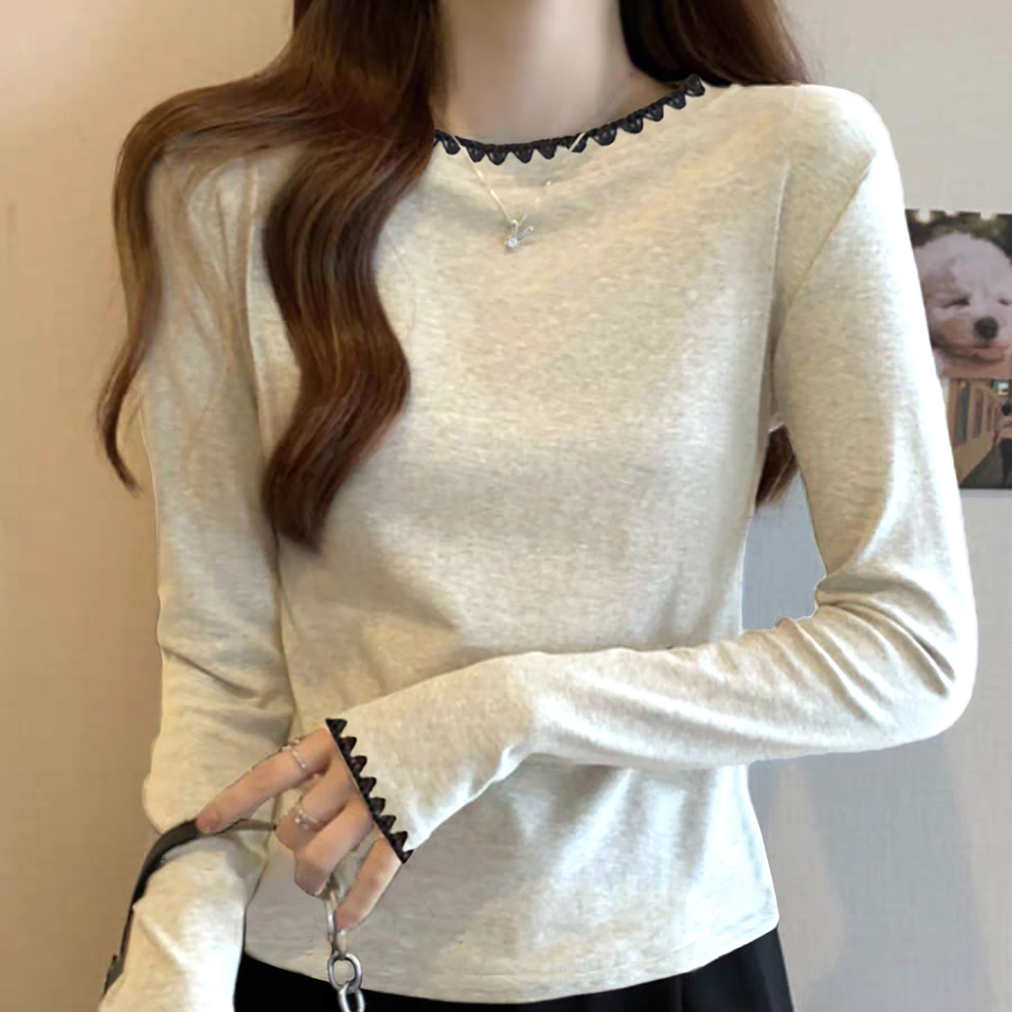 小众独特别致撞色长袖t恤女米灰色纯棉女装2025春秋新款潮流上衣
