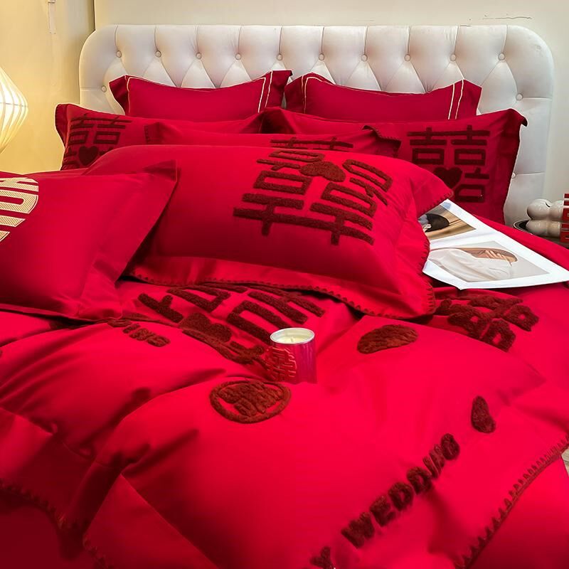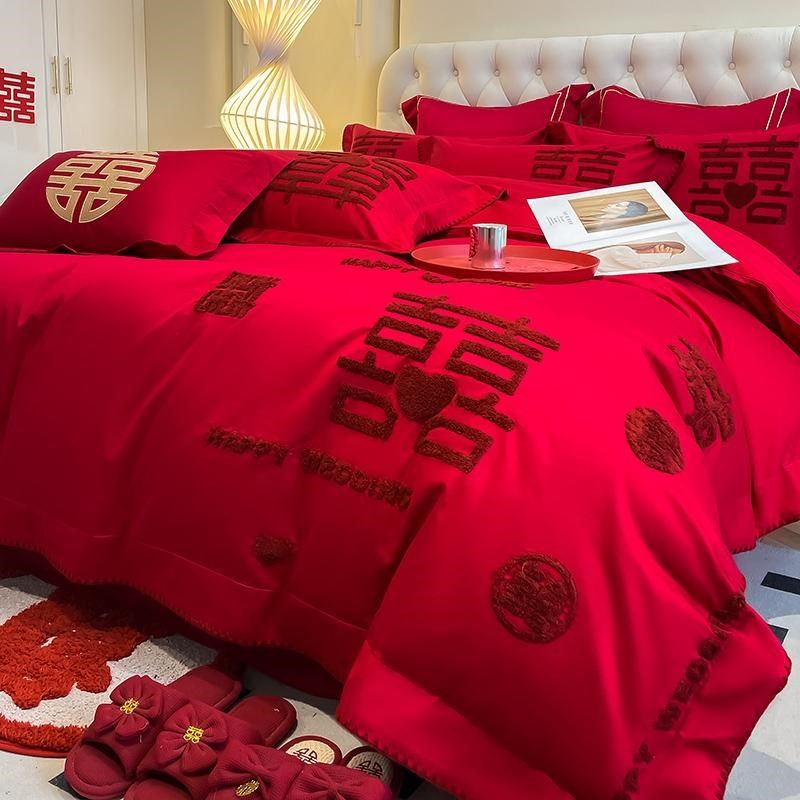 中式婚庆陪嫁亲肤棉四件套红色刺绣结婚床单被套喜庆床上用品
