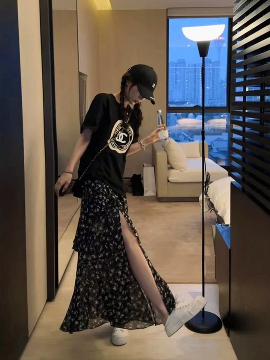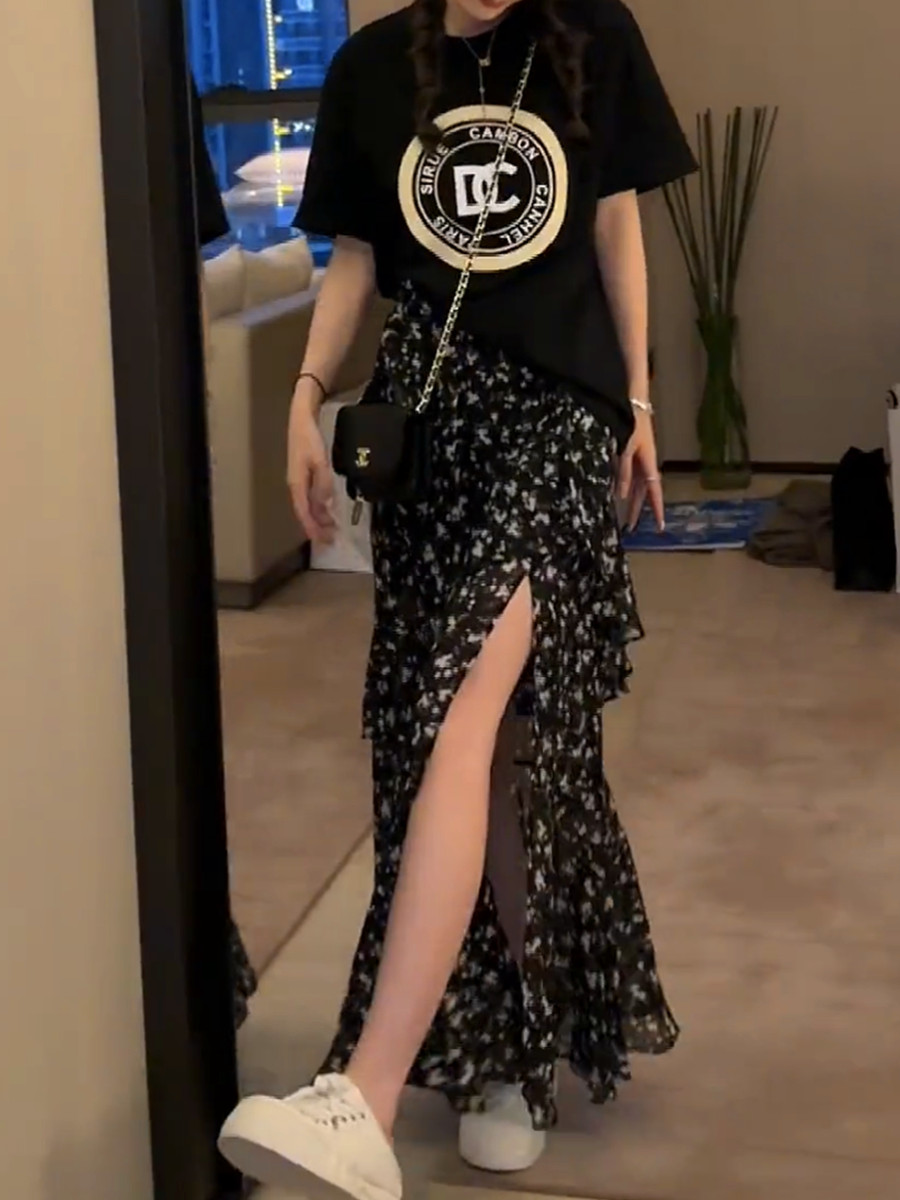 复古时尚套装女碎花荷叶边开叉半身中长裙夏季百搭短袖T恤两件套