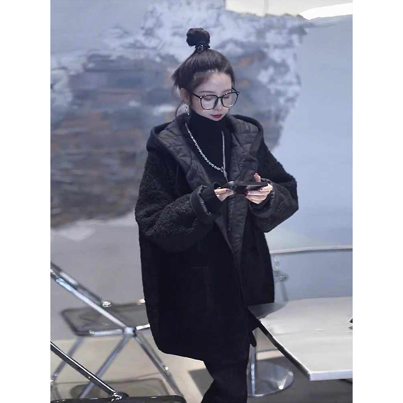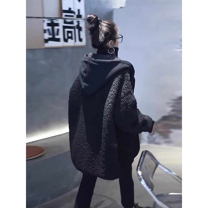 300斤特大码女装黑色连帽羊羔毛外套女胖mm冬季夹棉加厚连帽棉服