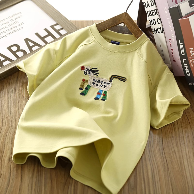 男童夏款纯棉短袖T恤2025新款中大童男孩时尚洋气刺绣圆领儿童衫