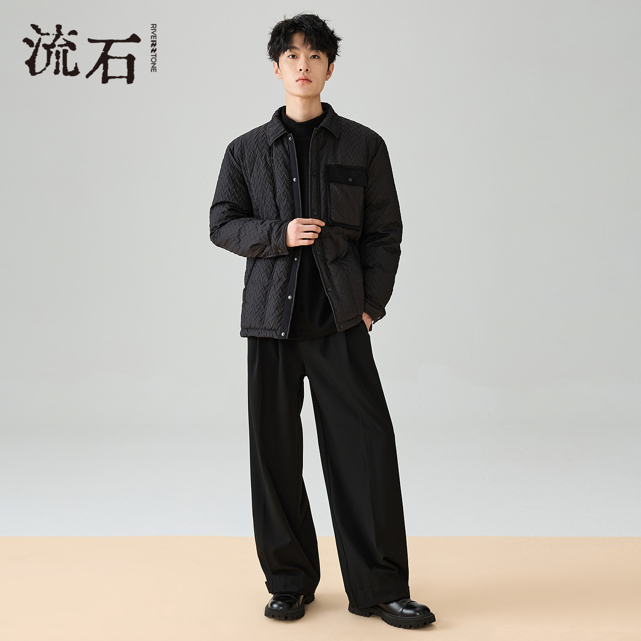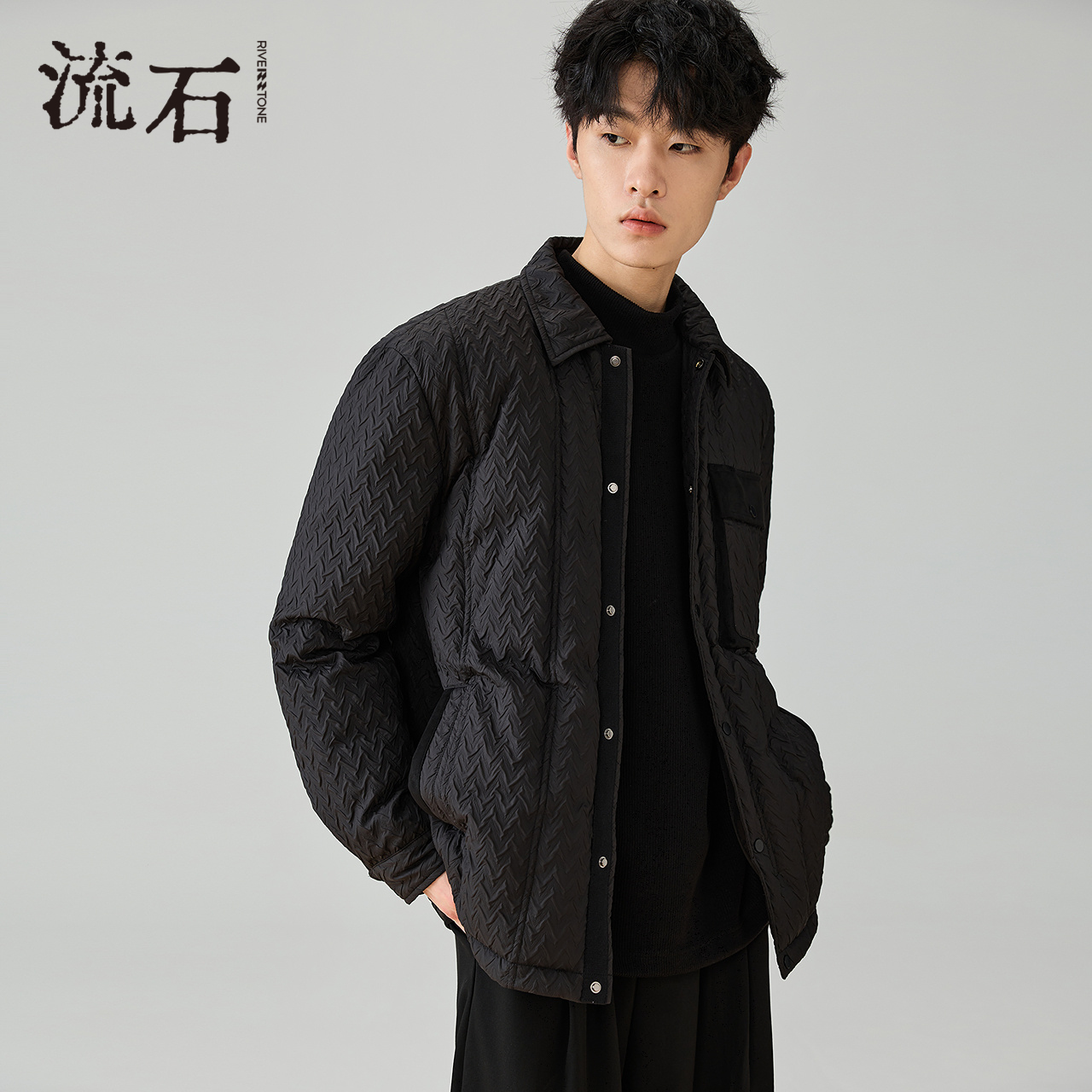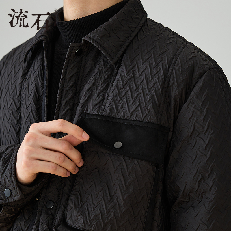 流石男装高级压花短款羽绒服2025年冬季新款男士拼接翻领外套夹克