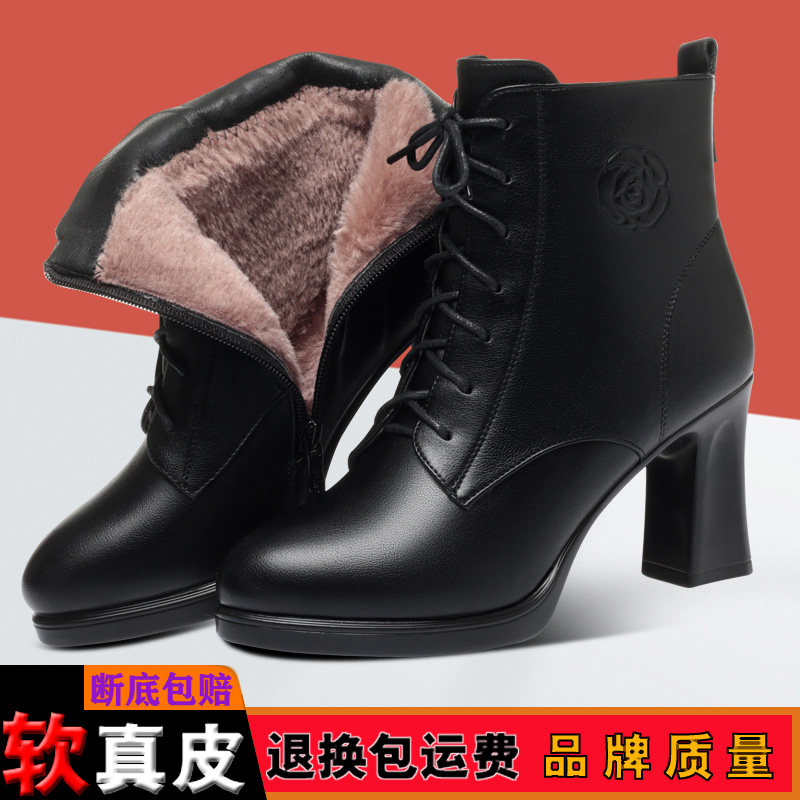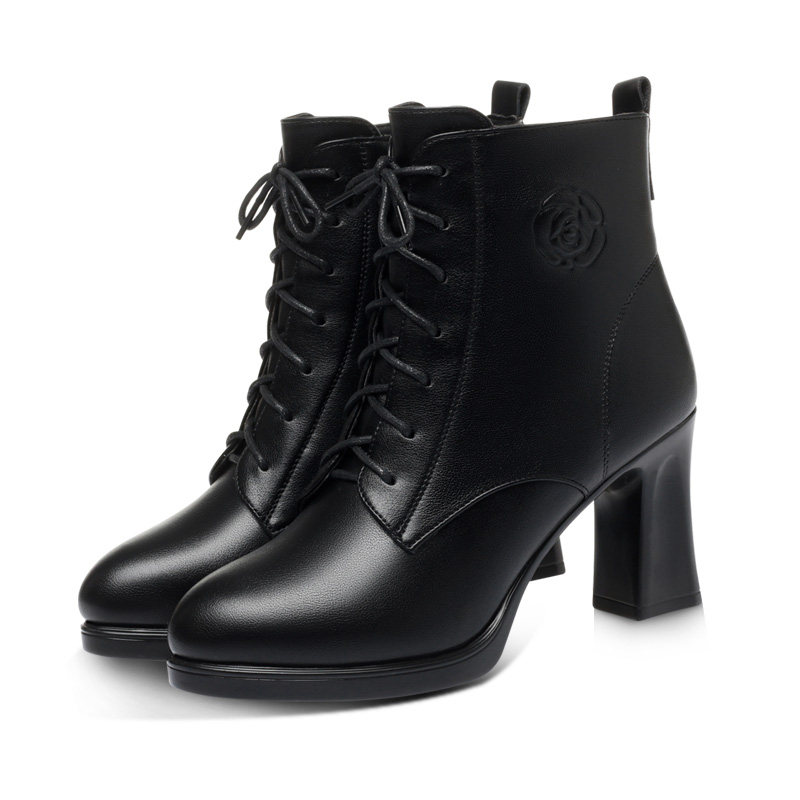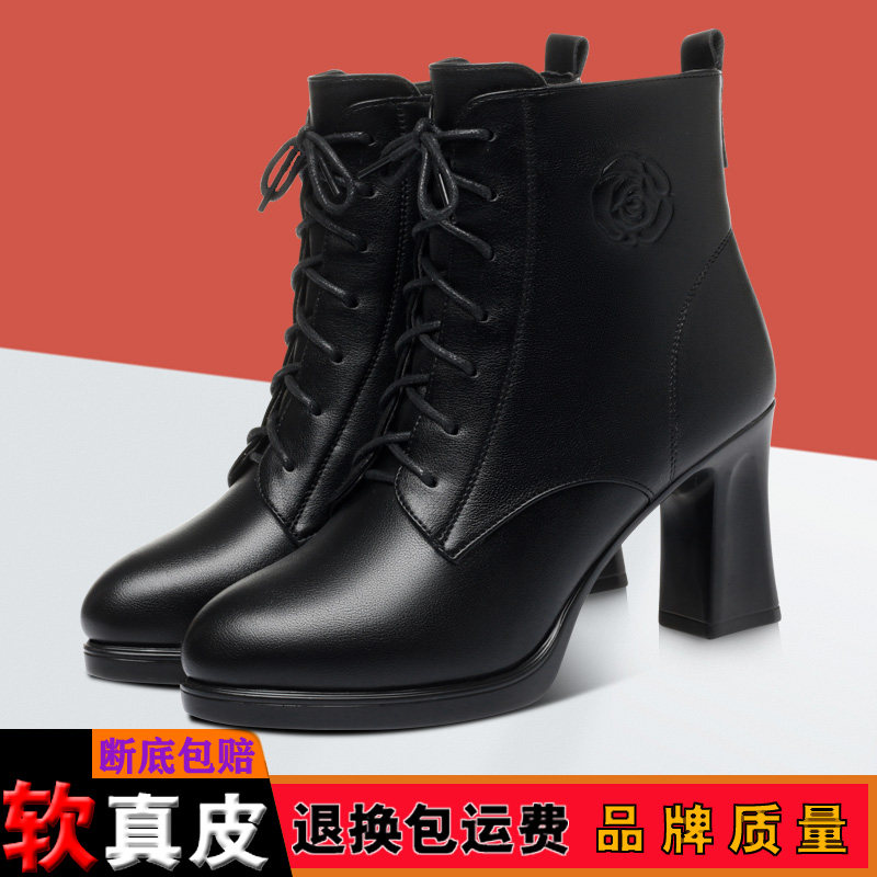 短靴女秋冬真皮马丁靴高跟防水台粗跟系带女靴加绒皮靴子新款单靴