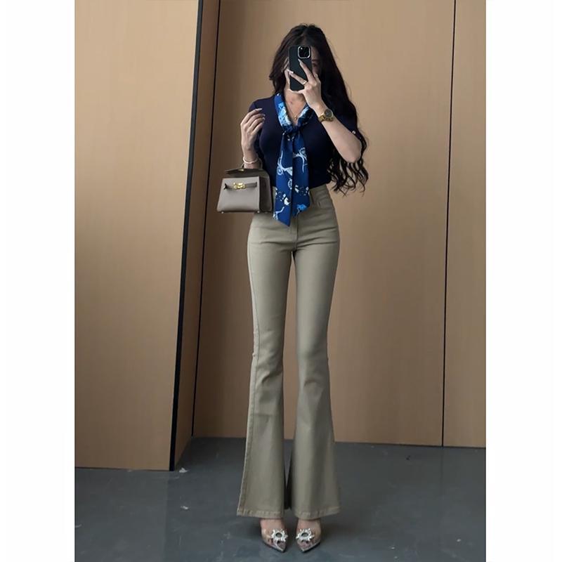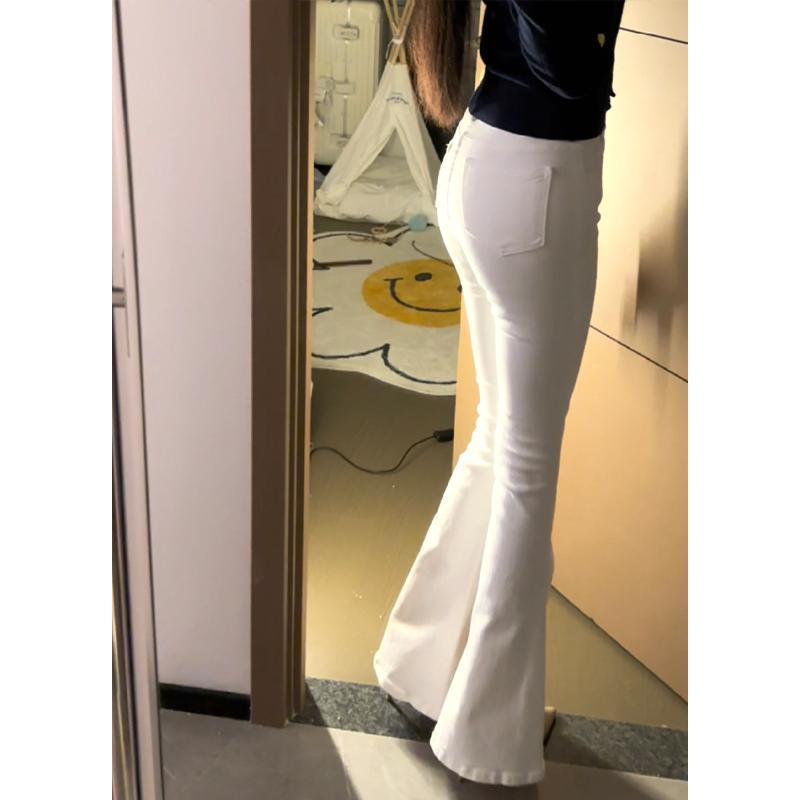 米白色双扣微喇叭裤新款牛仔裤女春夏季高腰修身弹力提臀拖地长裤