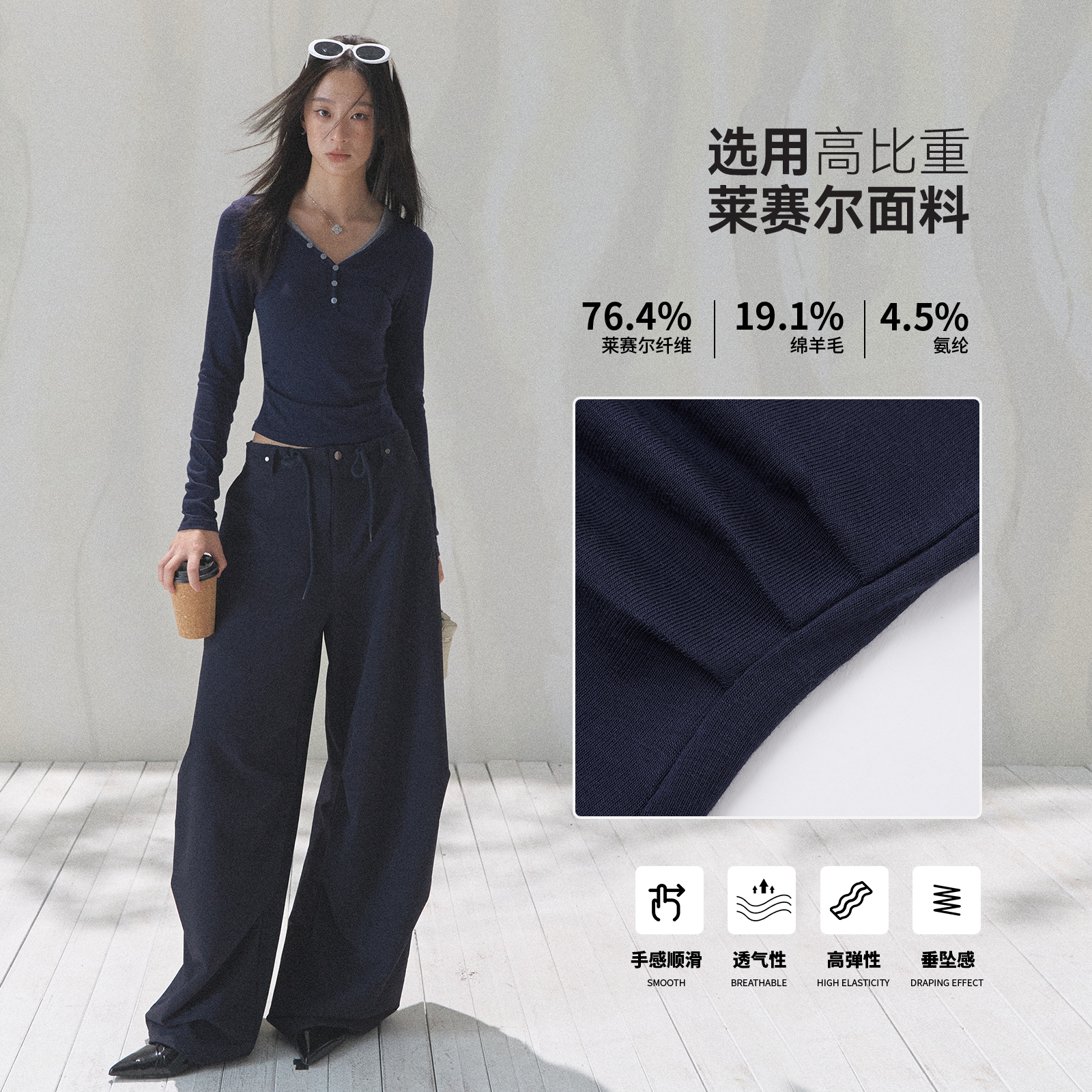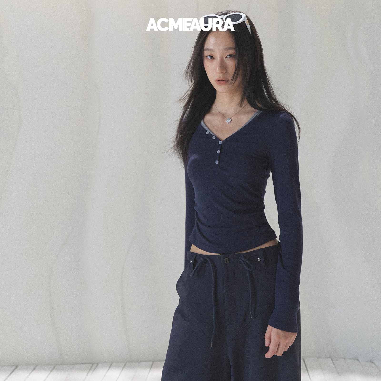 ACMEAURA藏蓝色长袖T恤女款早秋氛围感修身显瘦羊毛V领假两件上衣