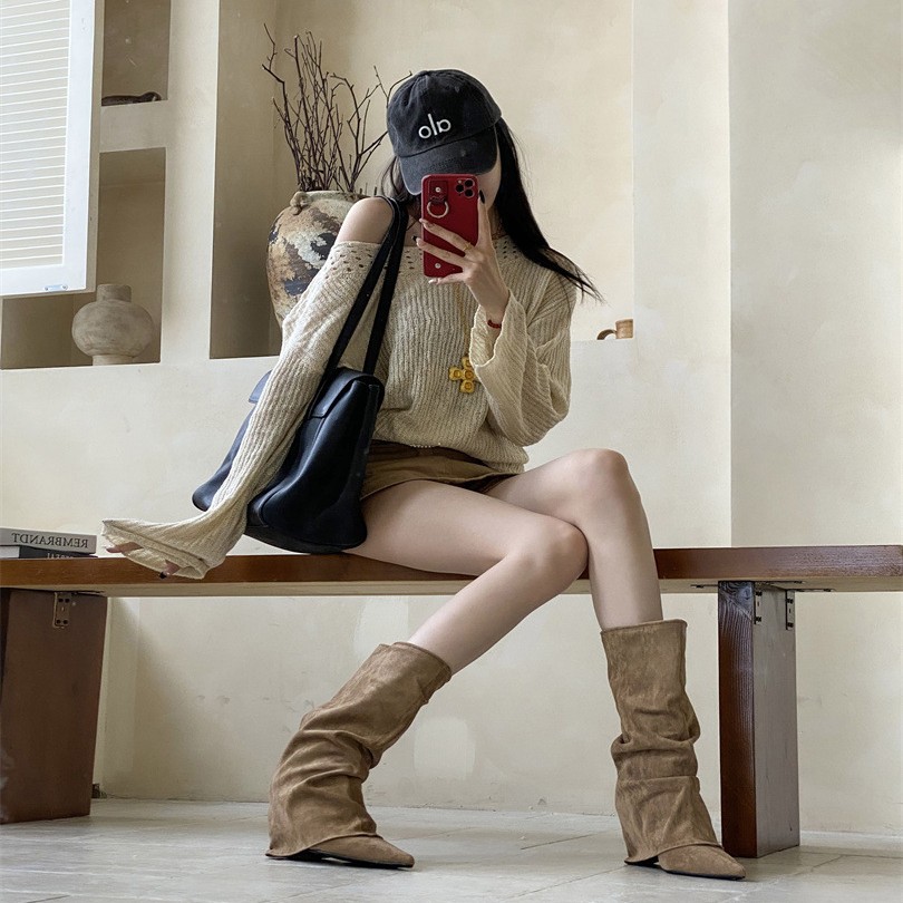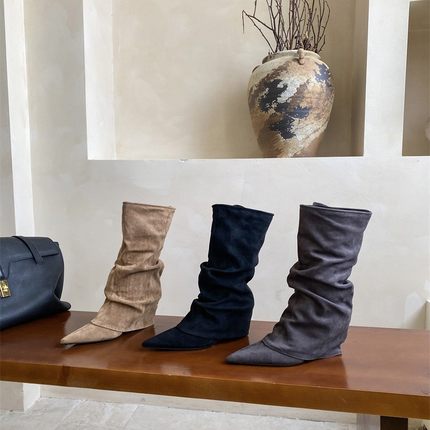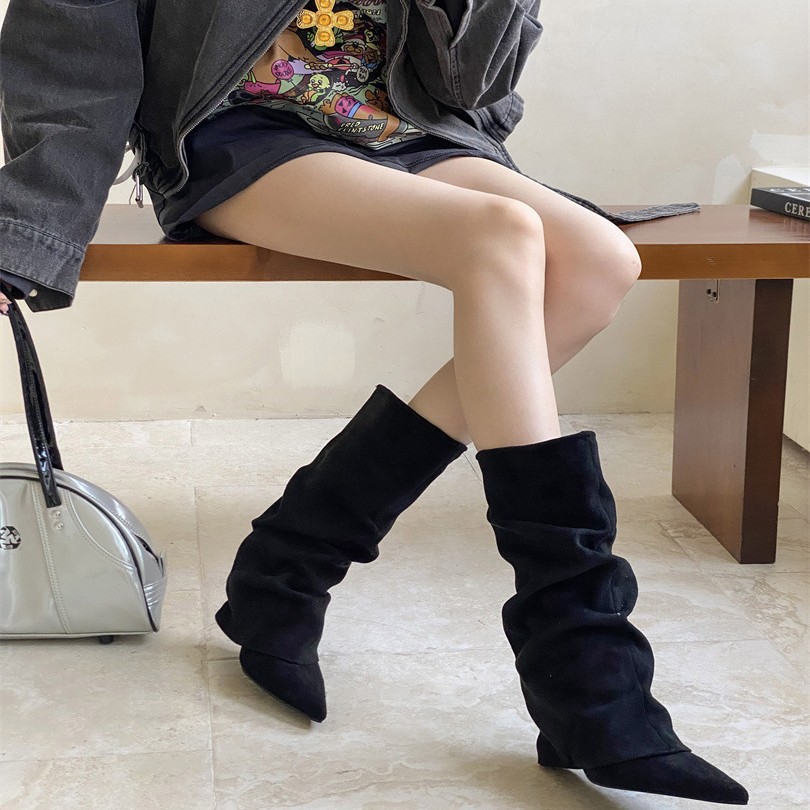 2025跨境时尚秋冬新款尖头坡跟皱褶及膝堆堆靴跨境性感女靴子