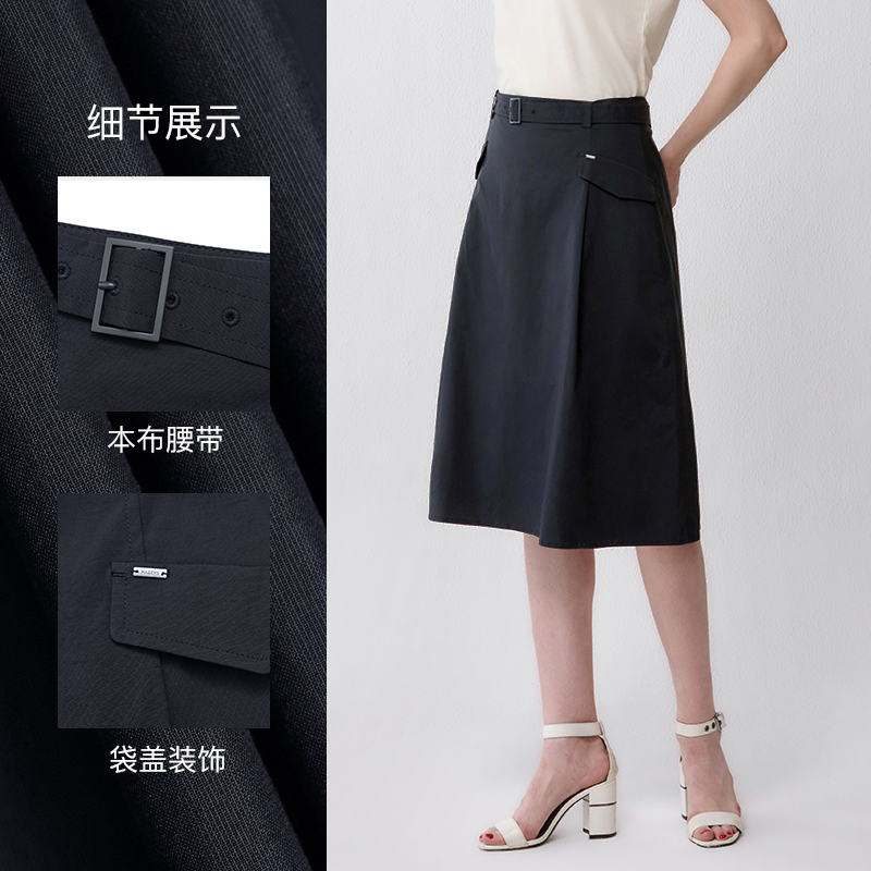 Hazzys哈吉斯简约A型过膝腰带半身裙女士通勤春夏英伦风休闲短裙