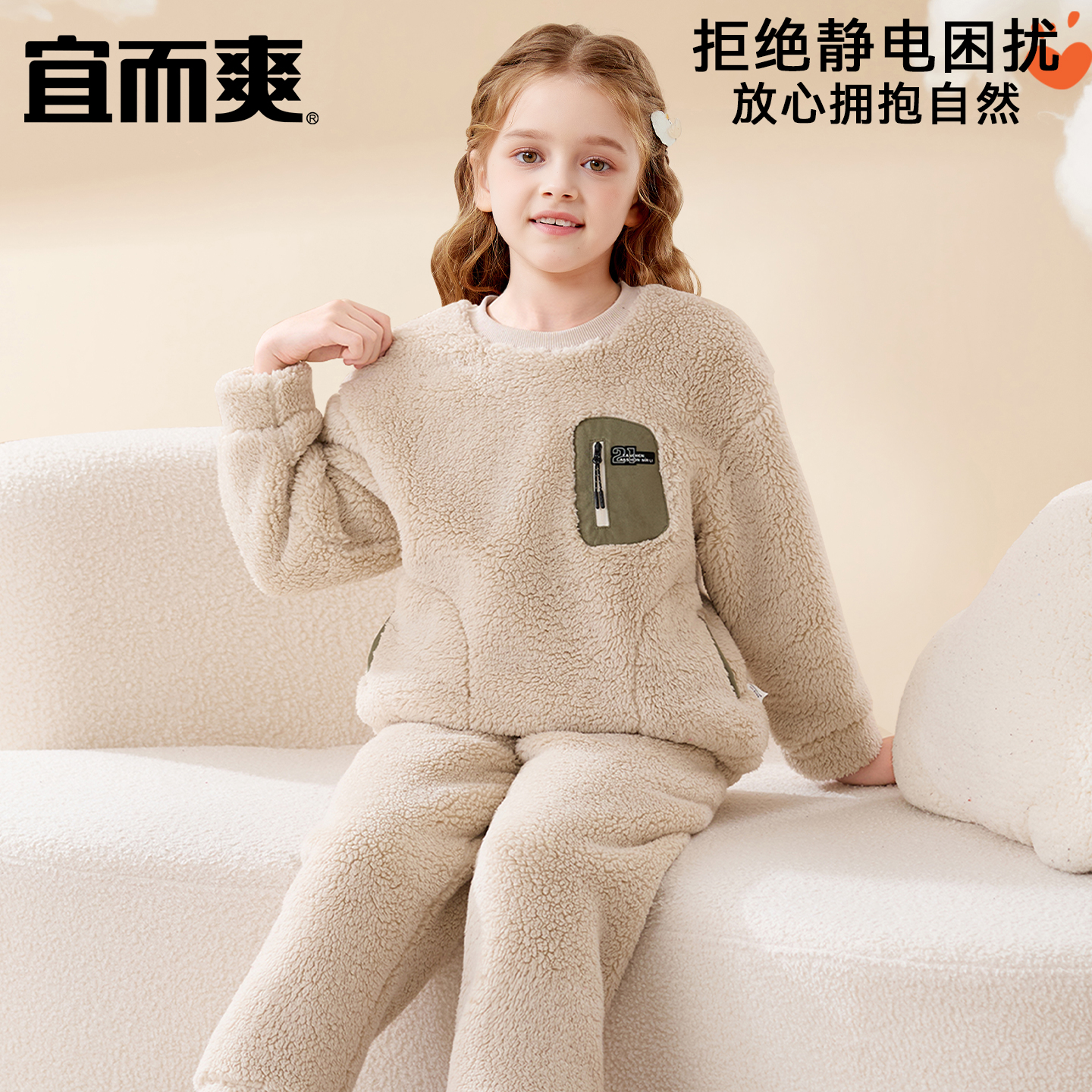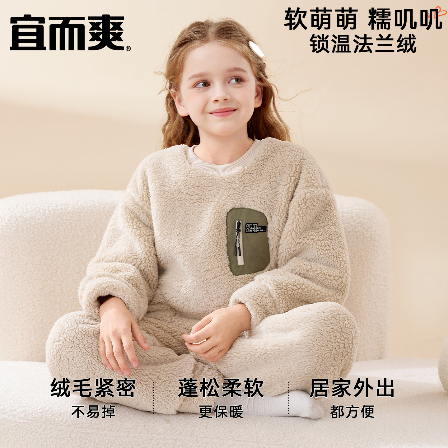 宜而爽儿童珊瑚绒睡衣女童家居服秋冬季法兰绒加厚套装男孩青少年