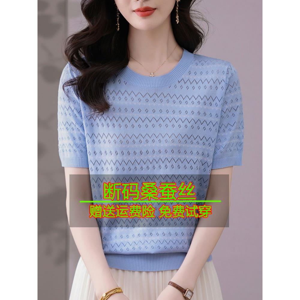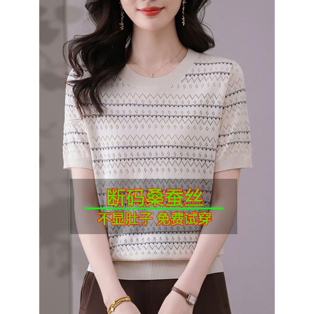 桑蚕丝女式短袖t恤,圆领条纹针织衬衫,夏季瘦妈妈宽松修身上衣