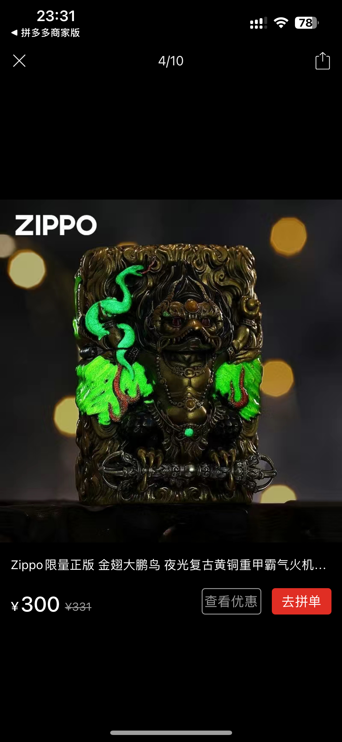 Zippo限量正版 金翅大鹏鸟 夜光复古黄铜重甲霸气火机男 节日礼物