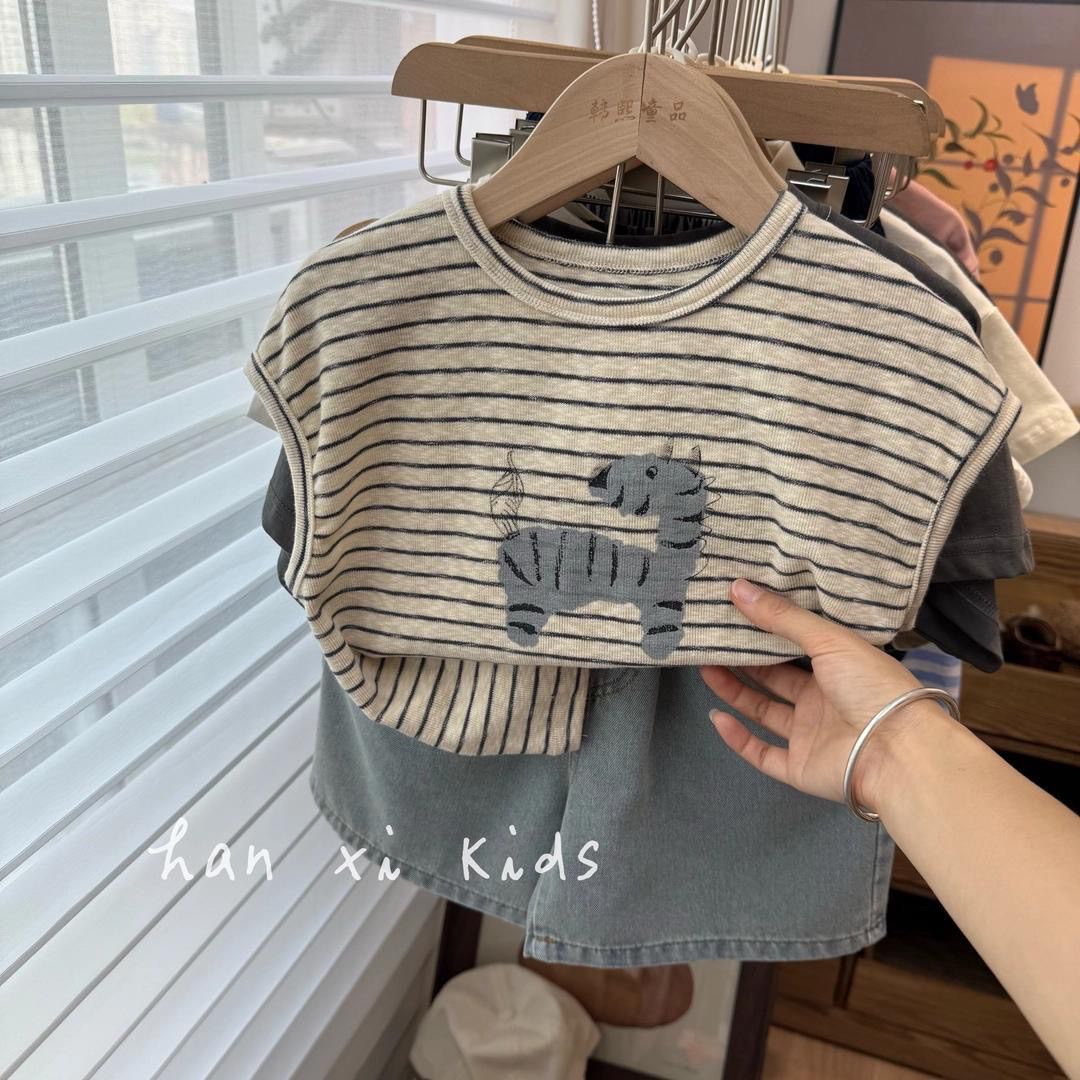 儿童套装2025夏季新品韩国男女童条纹落肩袖背心宝宝休闲牛仔短裤