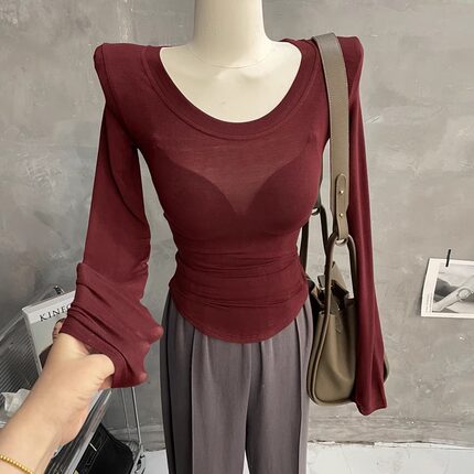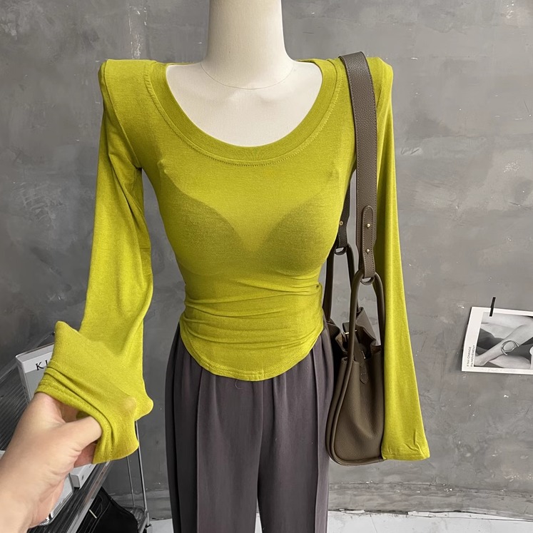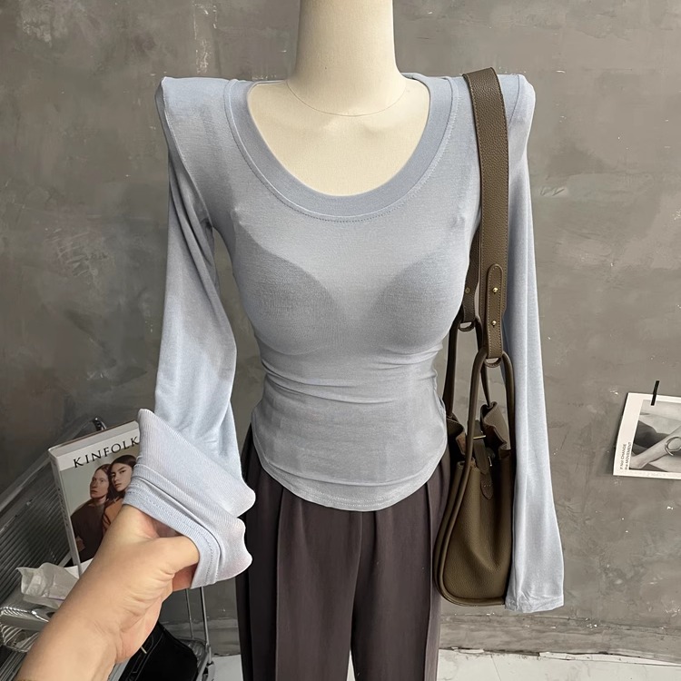 轻薄柔软~显胸大性感U领垫肩长袖T恤女微透打底衫紧身上衣内搭春