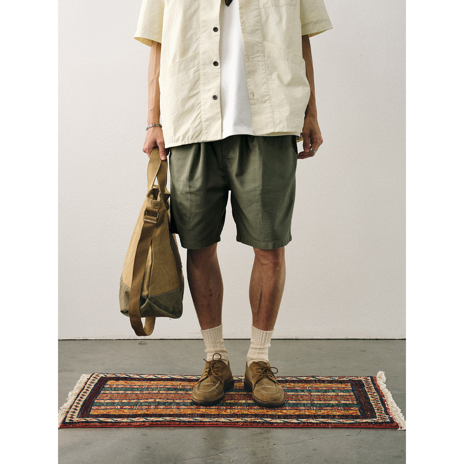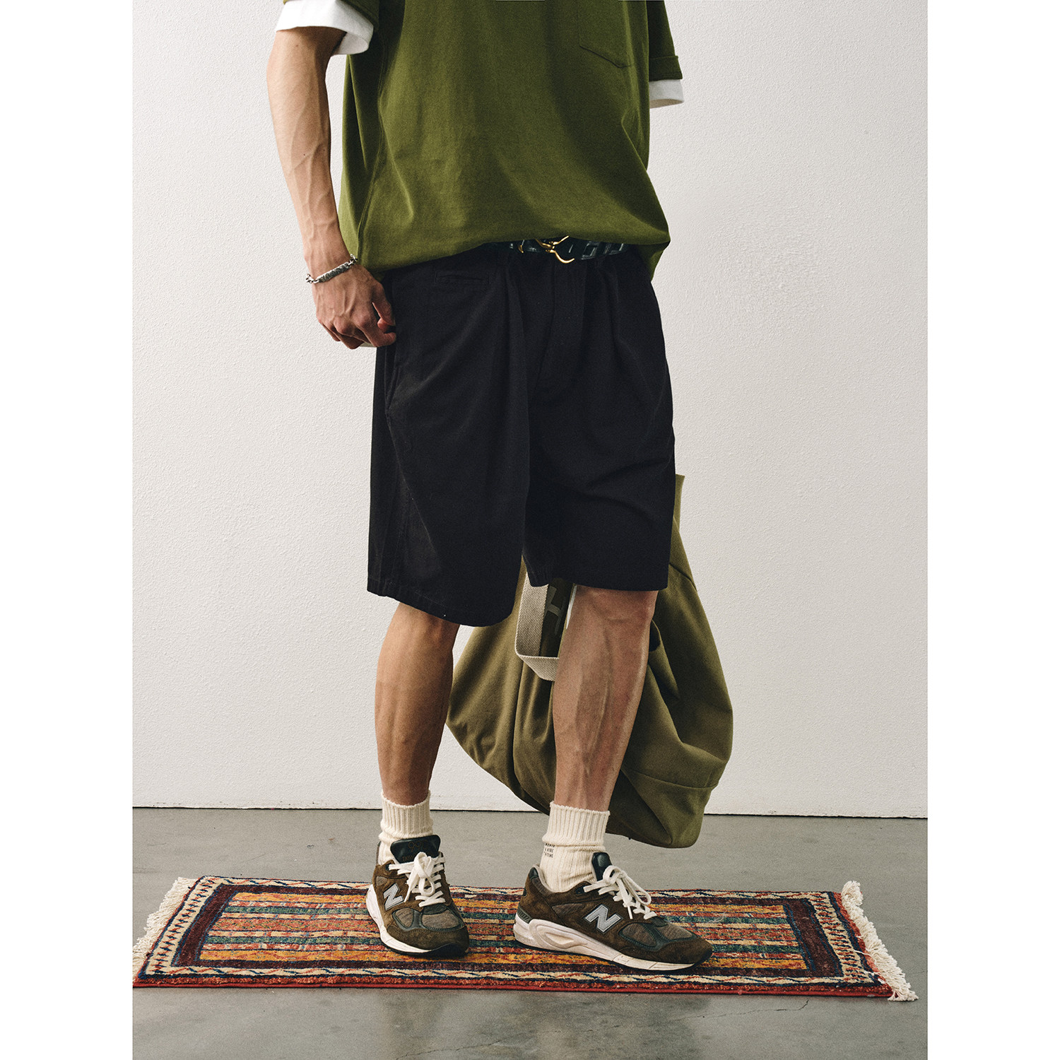 CENLES 日系复古水洗斜纹短裤男夏季宽松阔腿休闲裤松紧腰