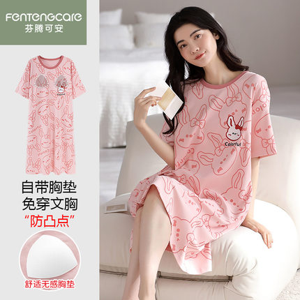 芬腾可安2025新款女士睡裙夏季纯棉短袖中长款家居服带胸垫连衣裙