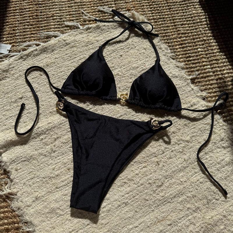 2025欧美新款锦纶性感比基尼有光金属环系带露背泳衣女士沙滩泳装