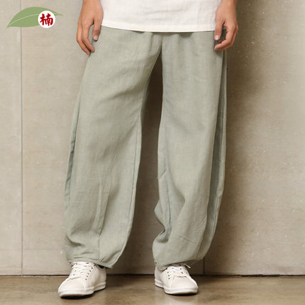 中国风全麻裤男夏季加肥苎麻男裤僧裤宽松长裤唐装收口裤子丹墨
