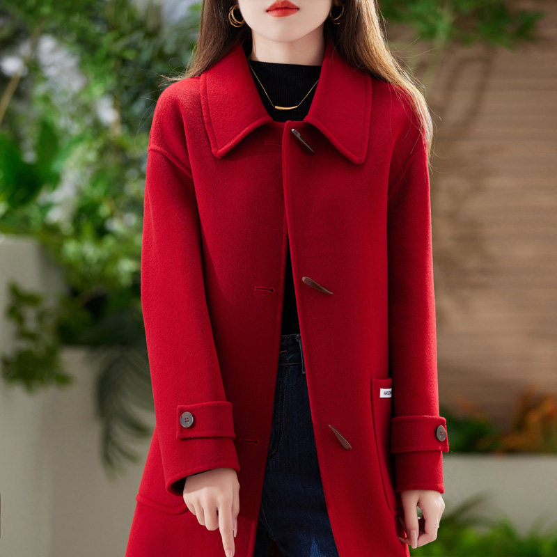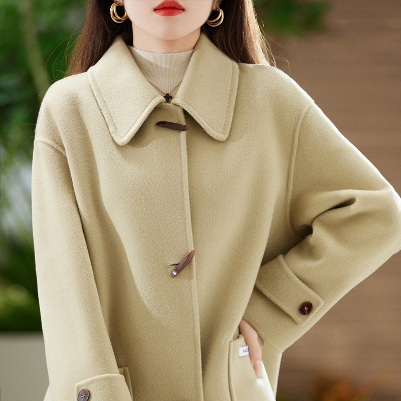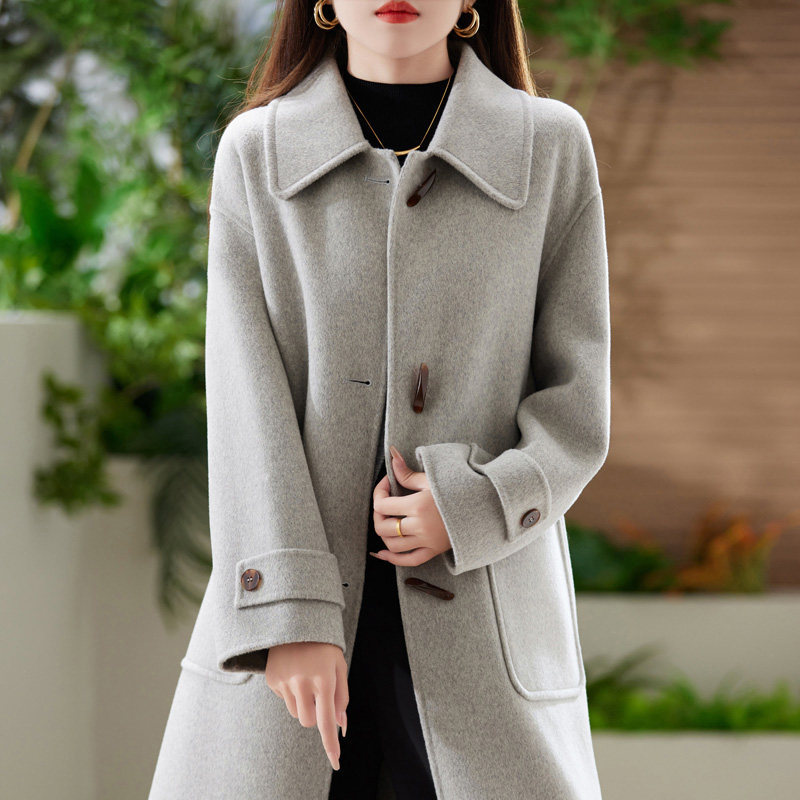 双面羊绒大衣女中长款新款娃娃领羊毛宽松双面呢子牛角扣毛呢外套