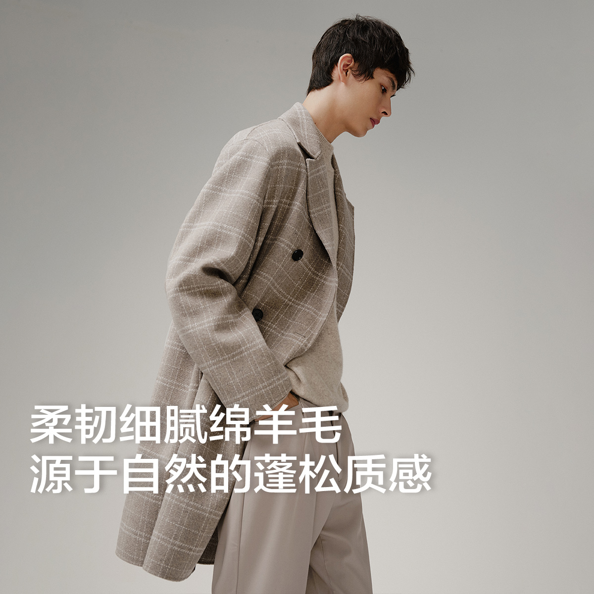 太平鸟男装格纹羊毛双面呢大衣2025冬新款时尚中长款宽松呢子外套
