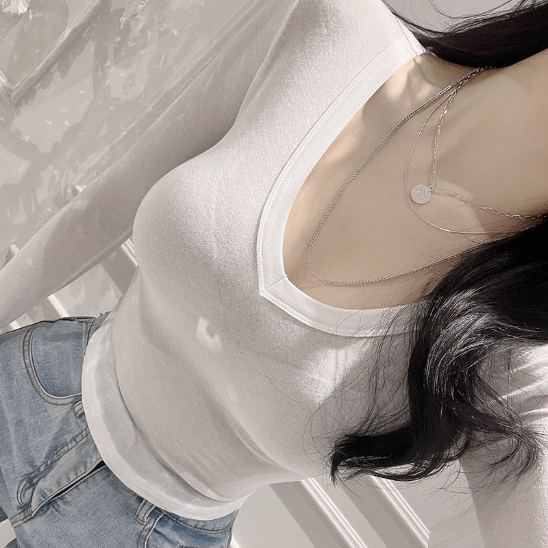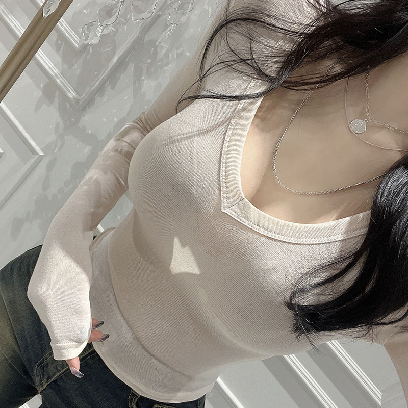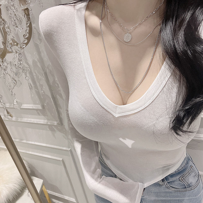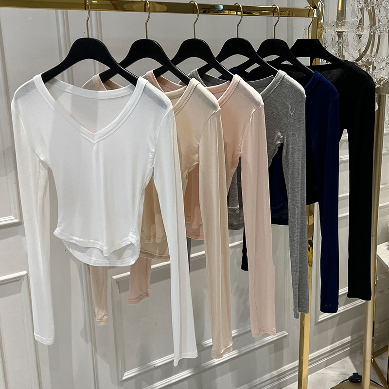 纯欲V领紧身薄款长袖打底衫女2024春夏短款性感显胸上衣不规则T恤