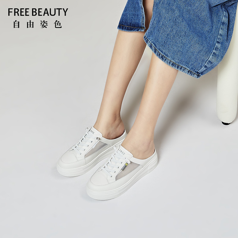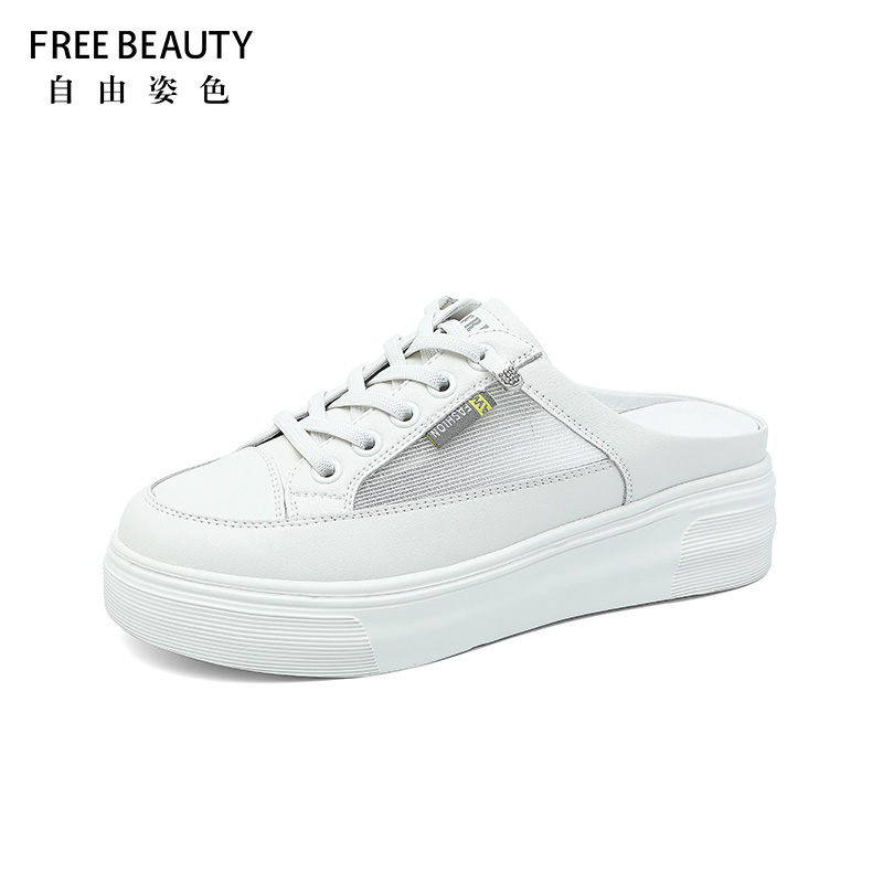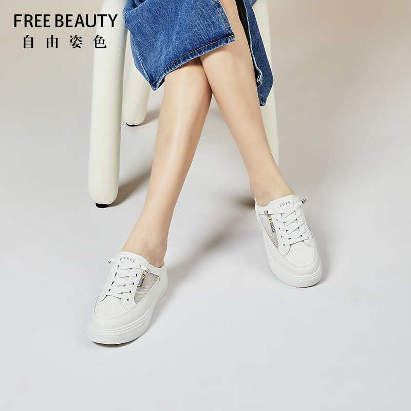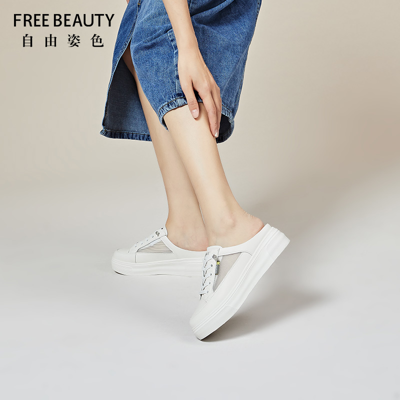自由姿色包一脚蹬半拖女外穿春新款厚底增高懒人透气网面小白鞋女