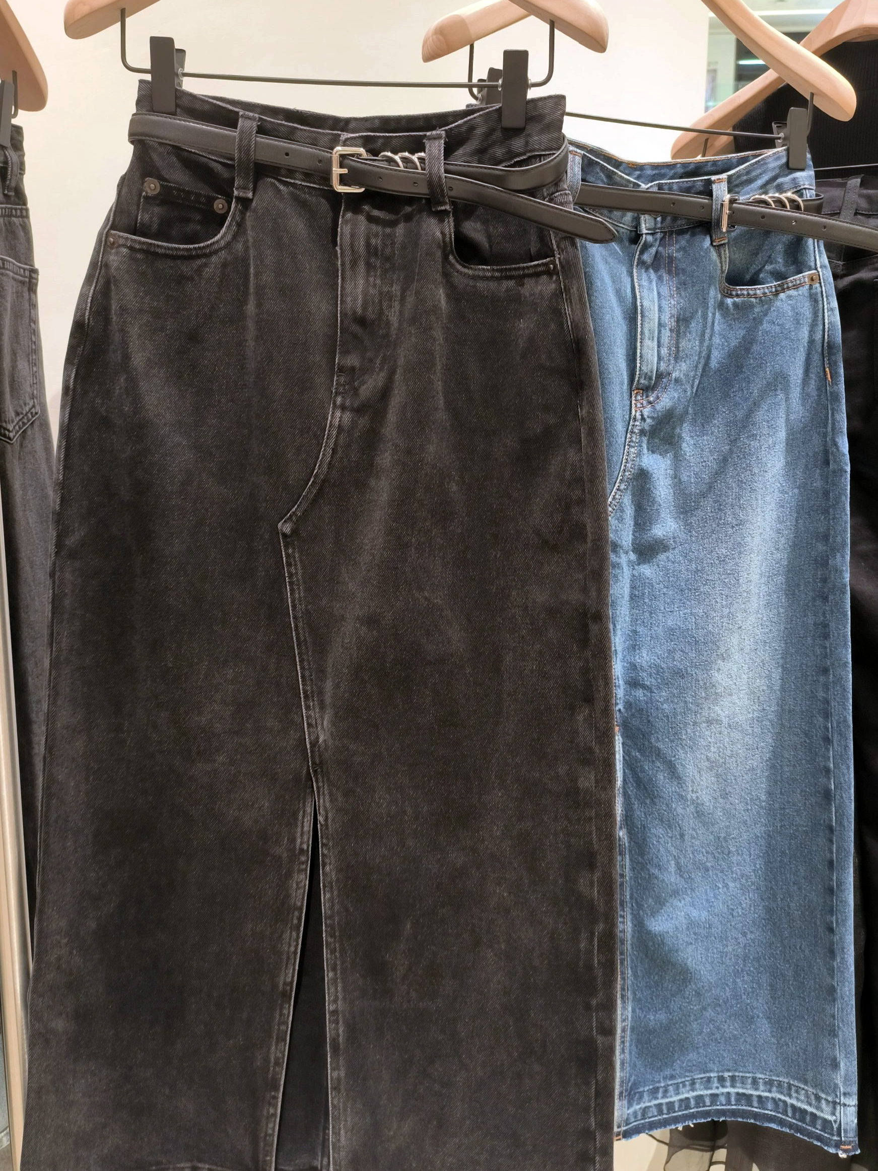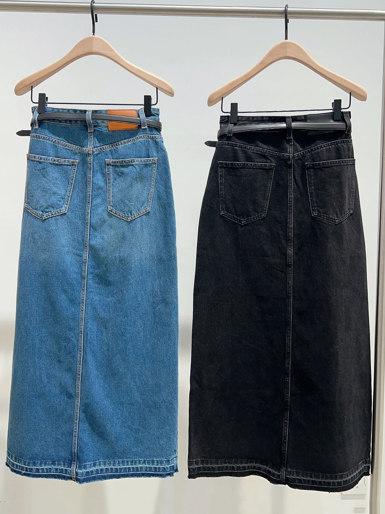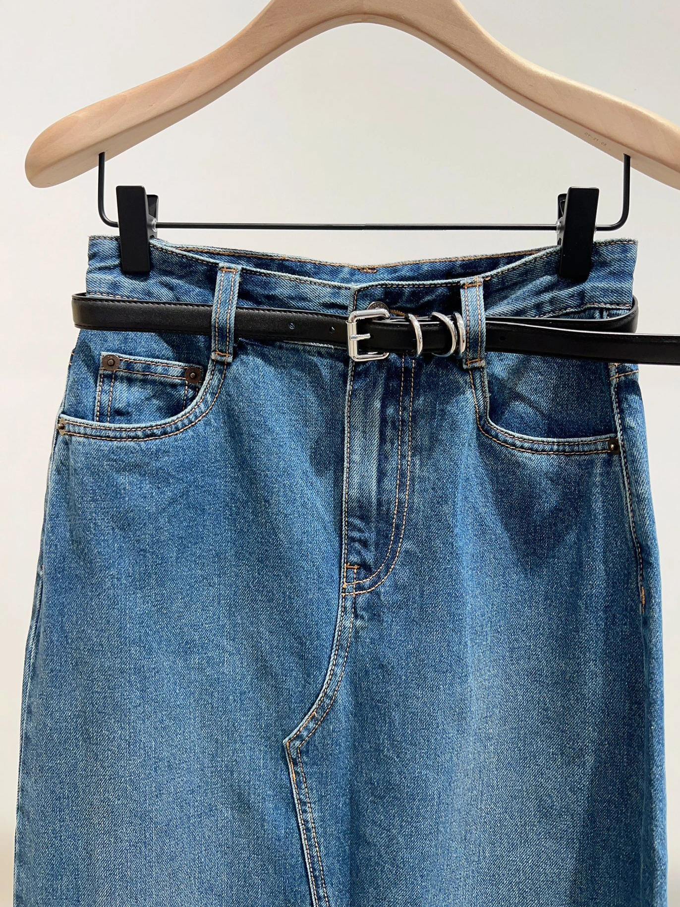 【特价清仓】设计感欧可摩前开叉须边牛仔半身裙女长款配真皮腰带