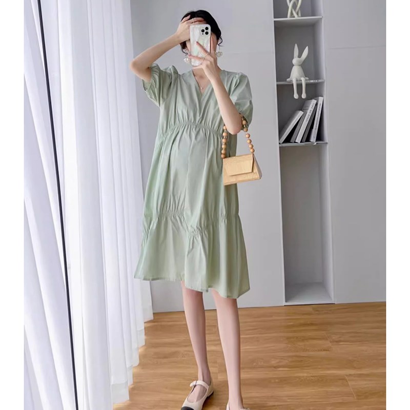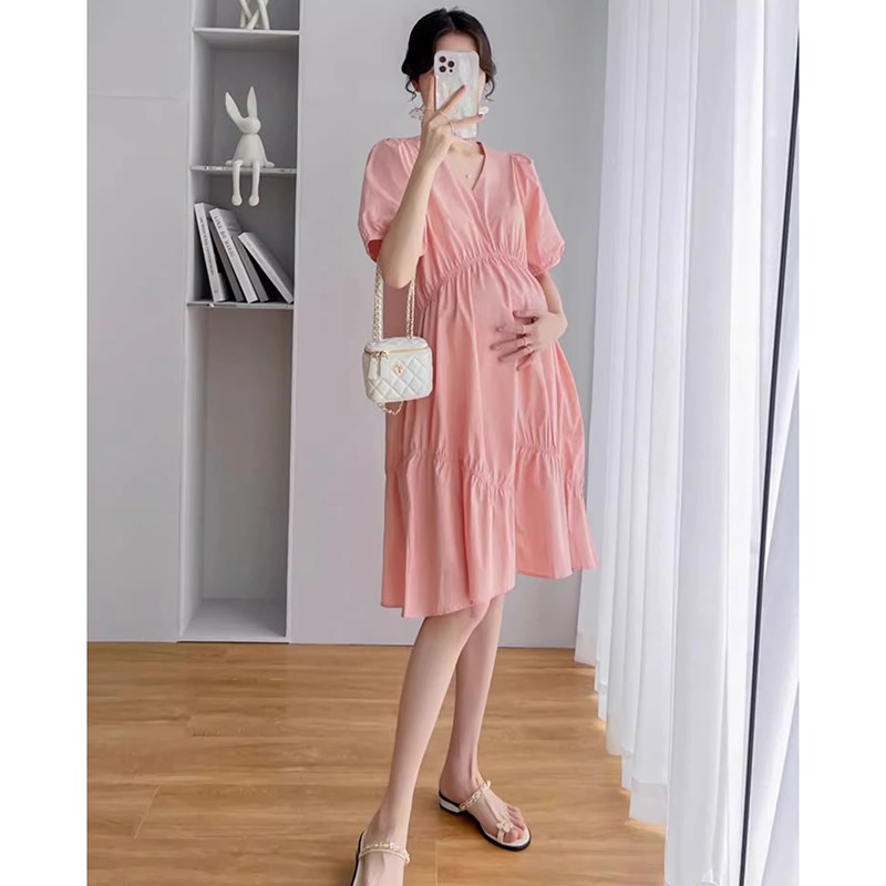 孕妇连衣裙夏2025新款V领短袖宽松显瘦休闲褶皱薄W款小个子中长款