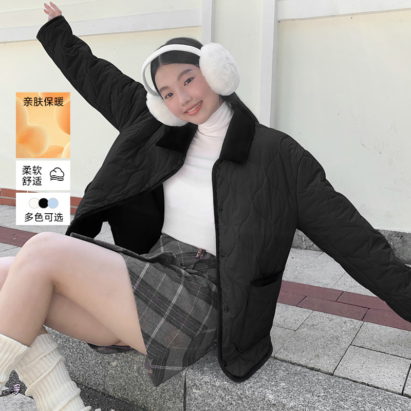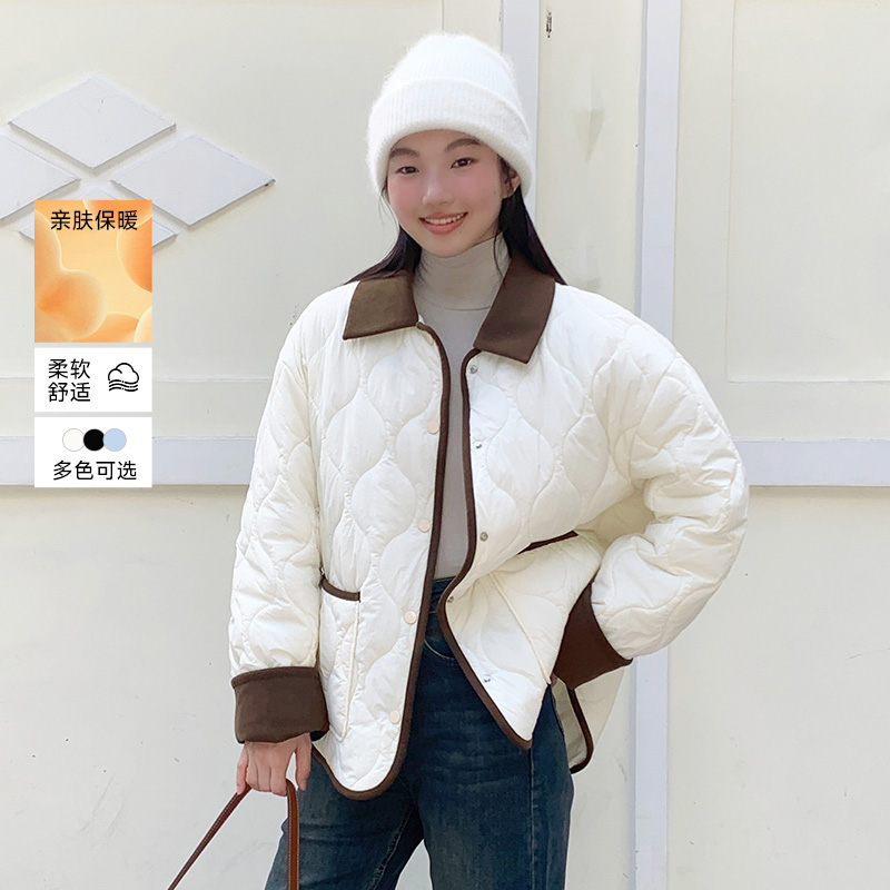NOW真维斯轻薄棉服女2025新款撞色翻领秋冬菱格衬衫领夹棉外套女