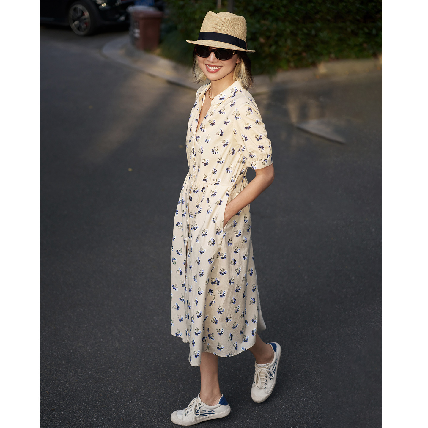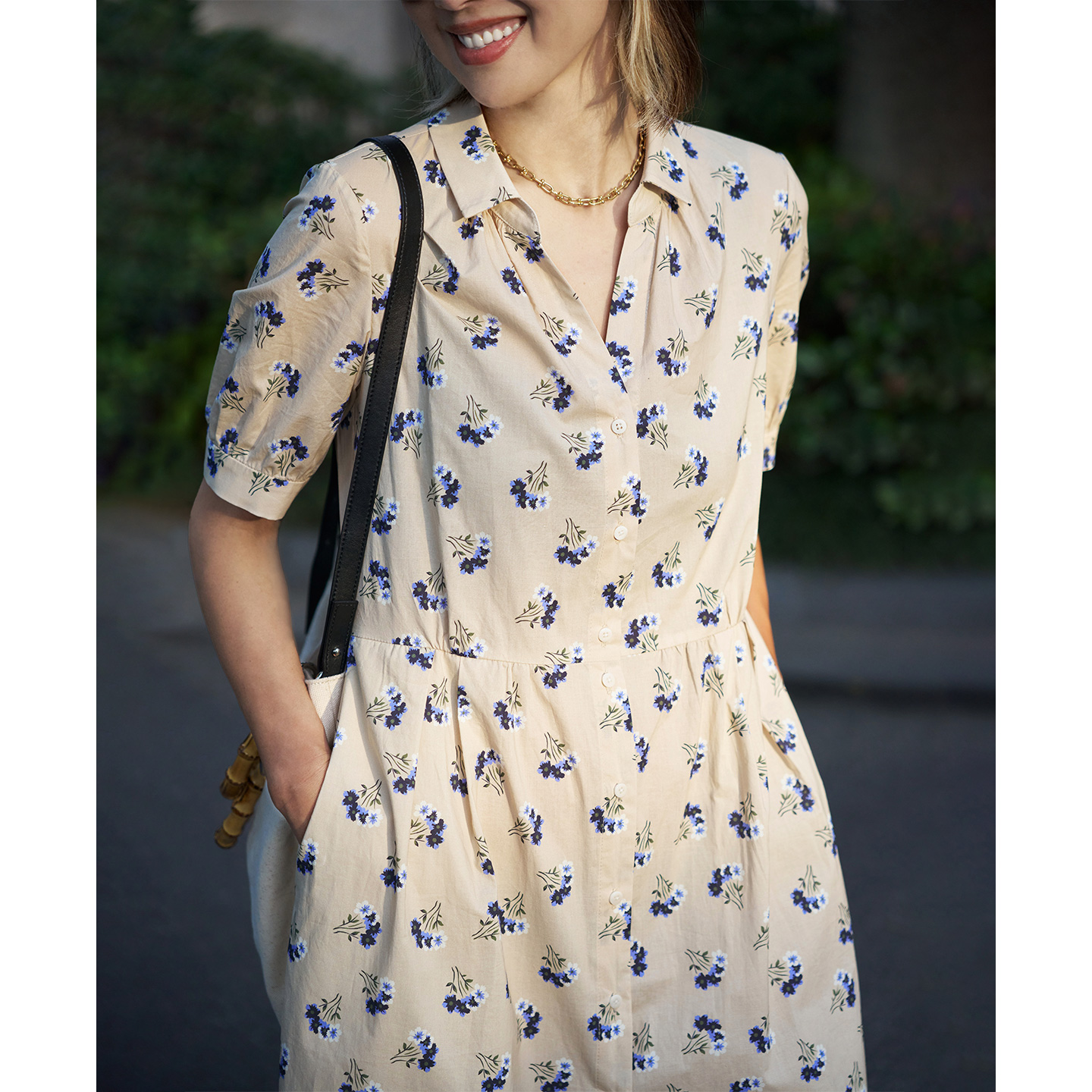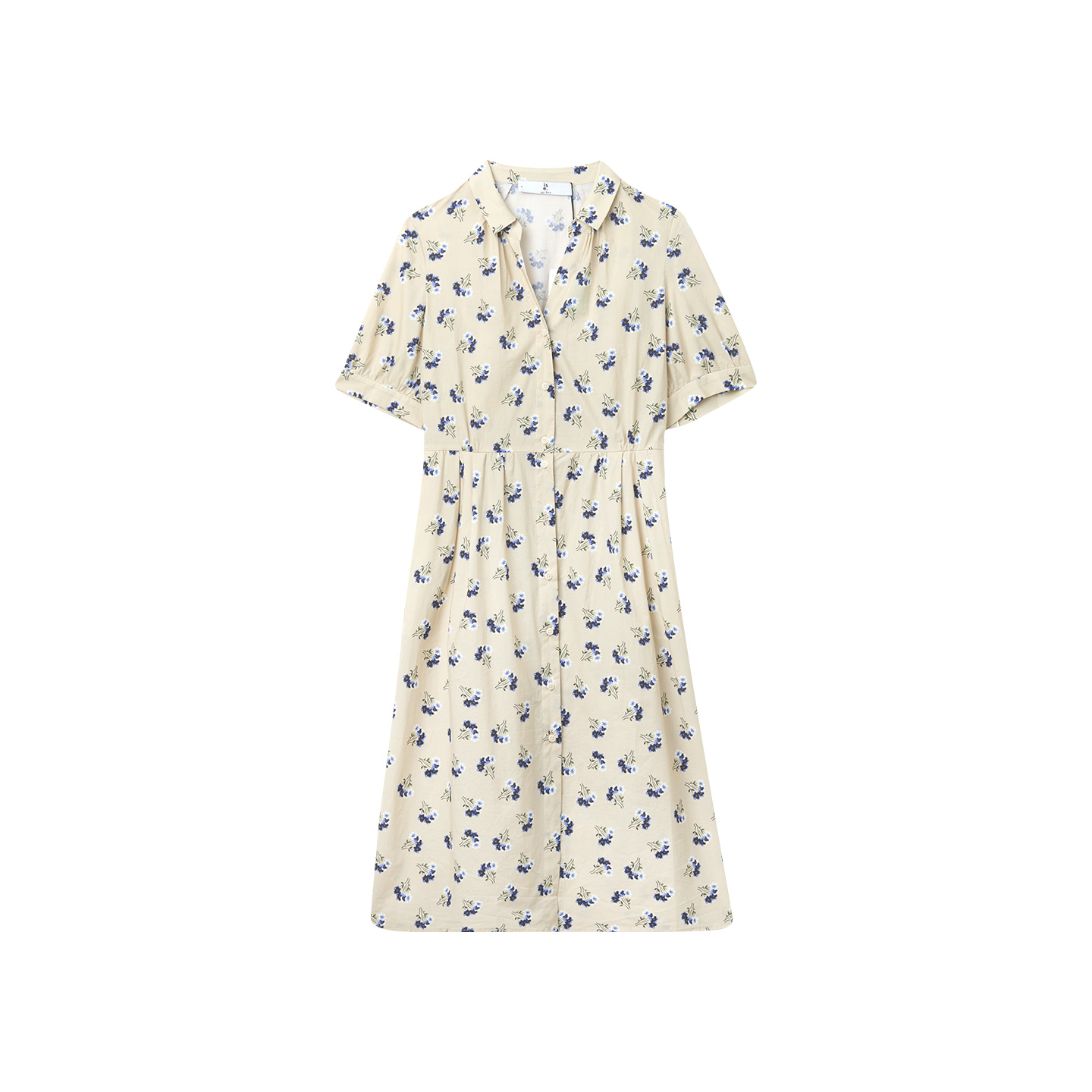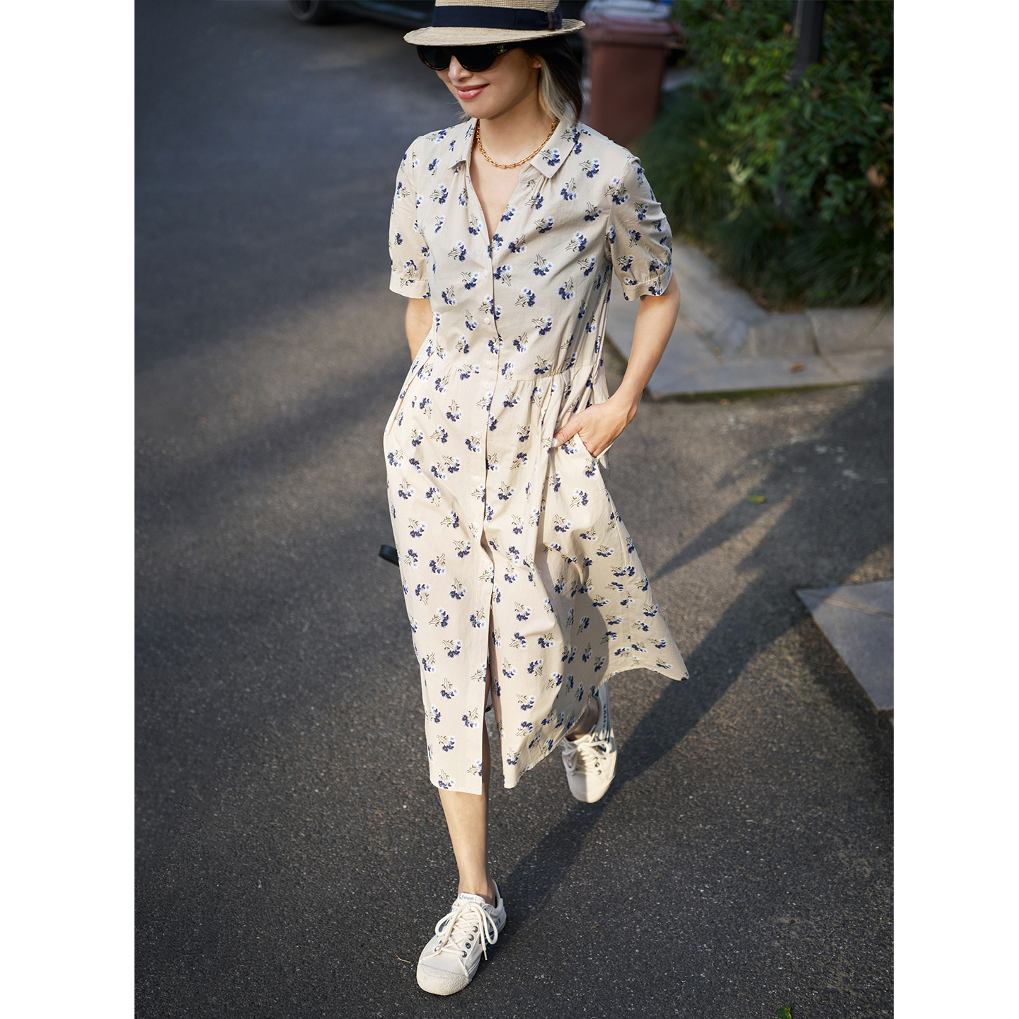 ise“马约尔花园”系列100%棉衬衫领复古印花连衣裙P2520782