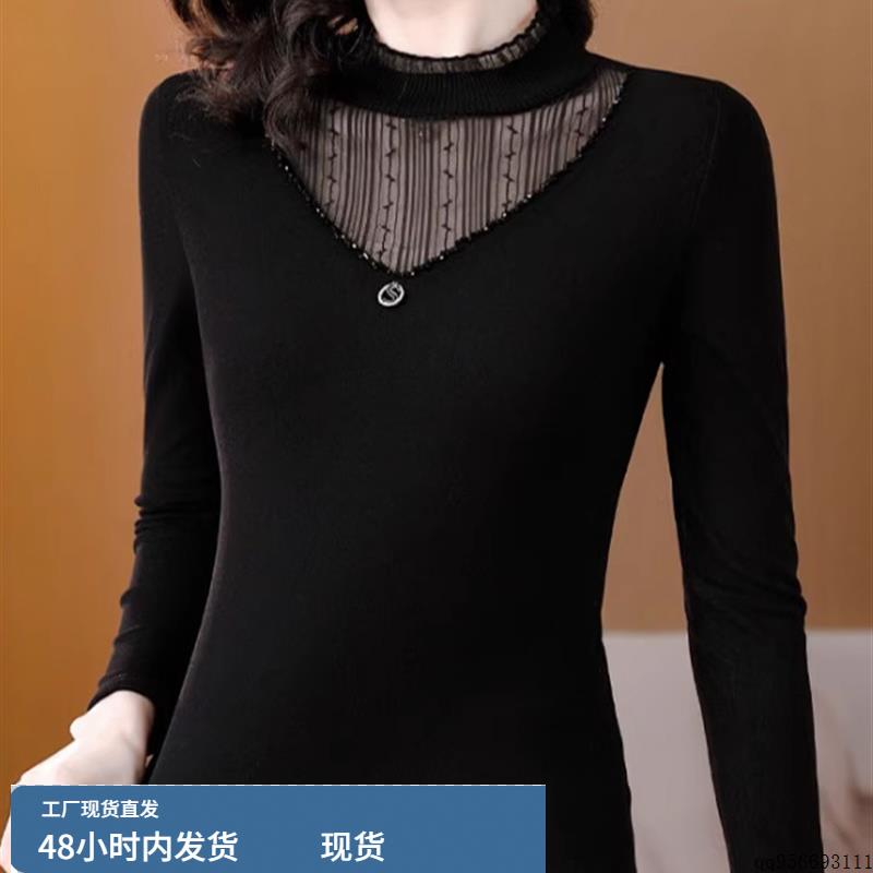 黑色烫钻网纱蕾丝打底衫女秋冬新款长袖t恤弹力修身显瘦妈妈上衣