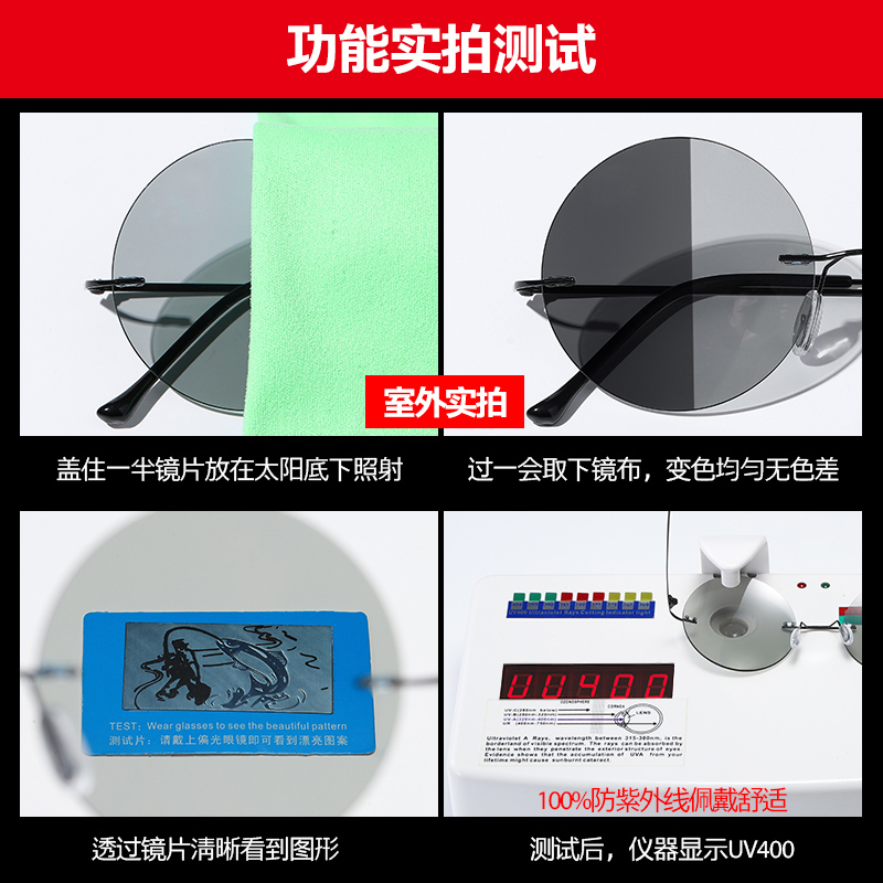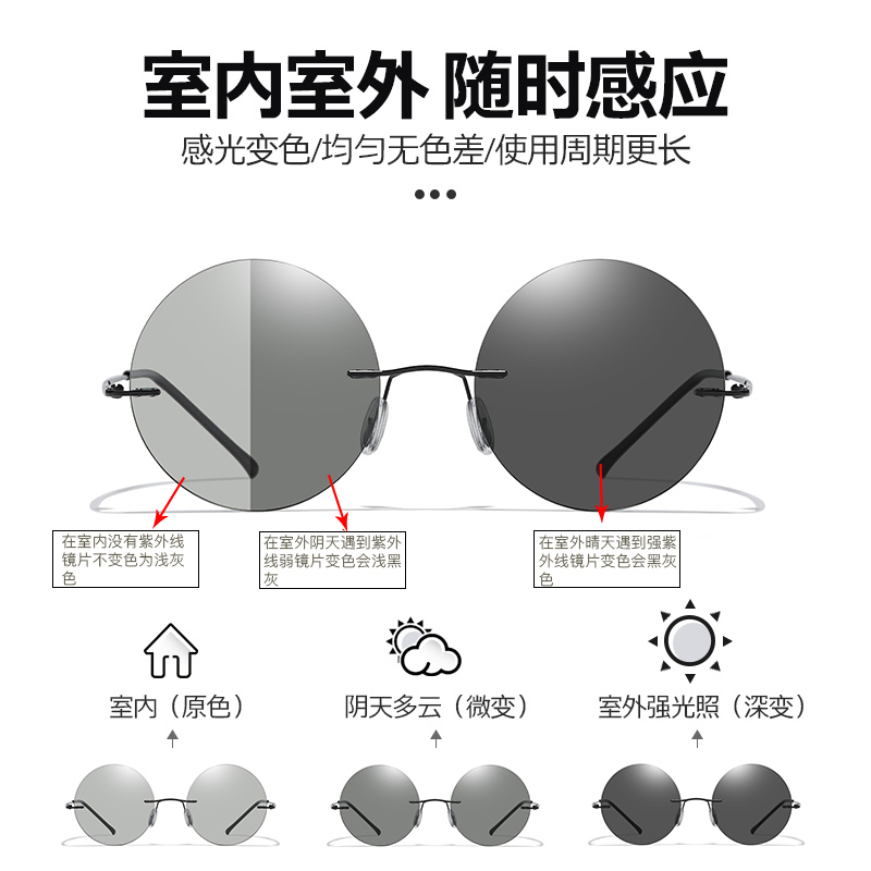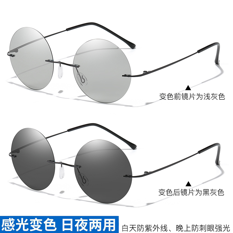超轻纯钛无框圆形变色墨镜女日夜两用开车专用偏光太阳眼镜男复古