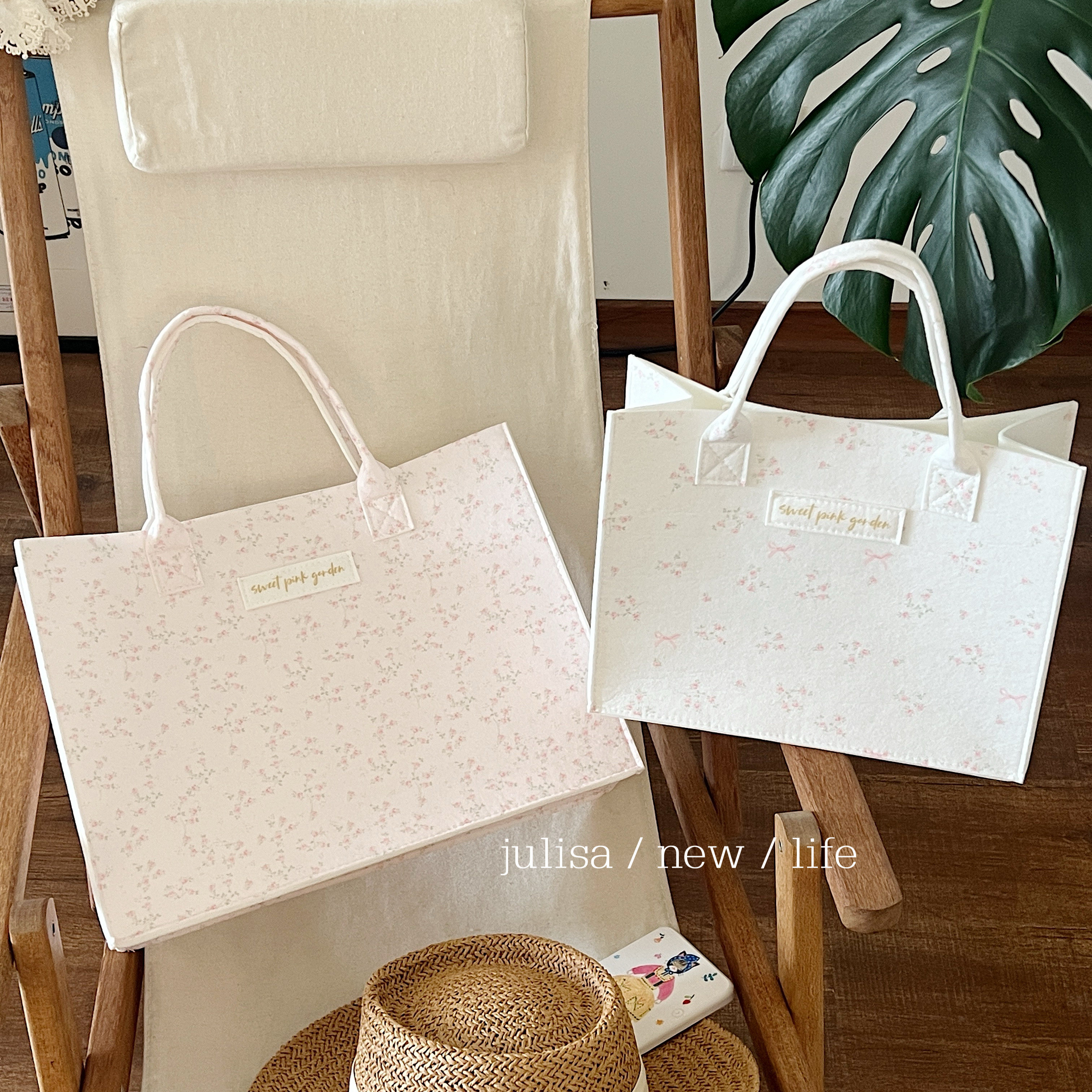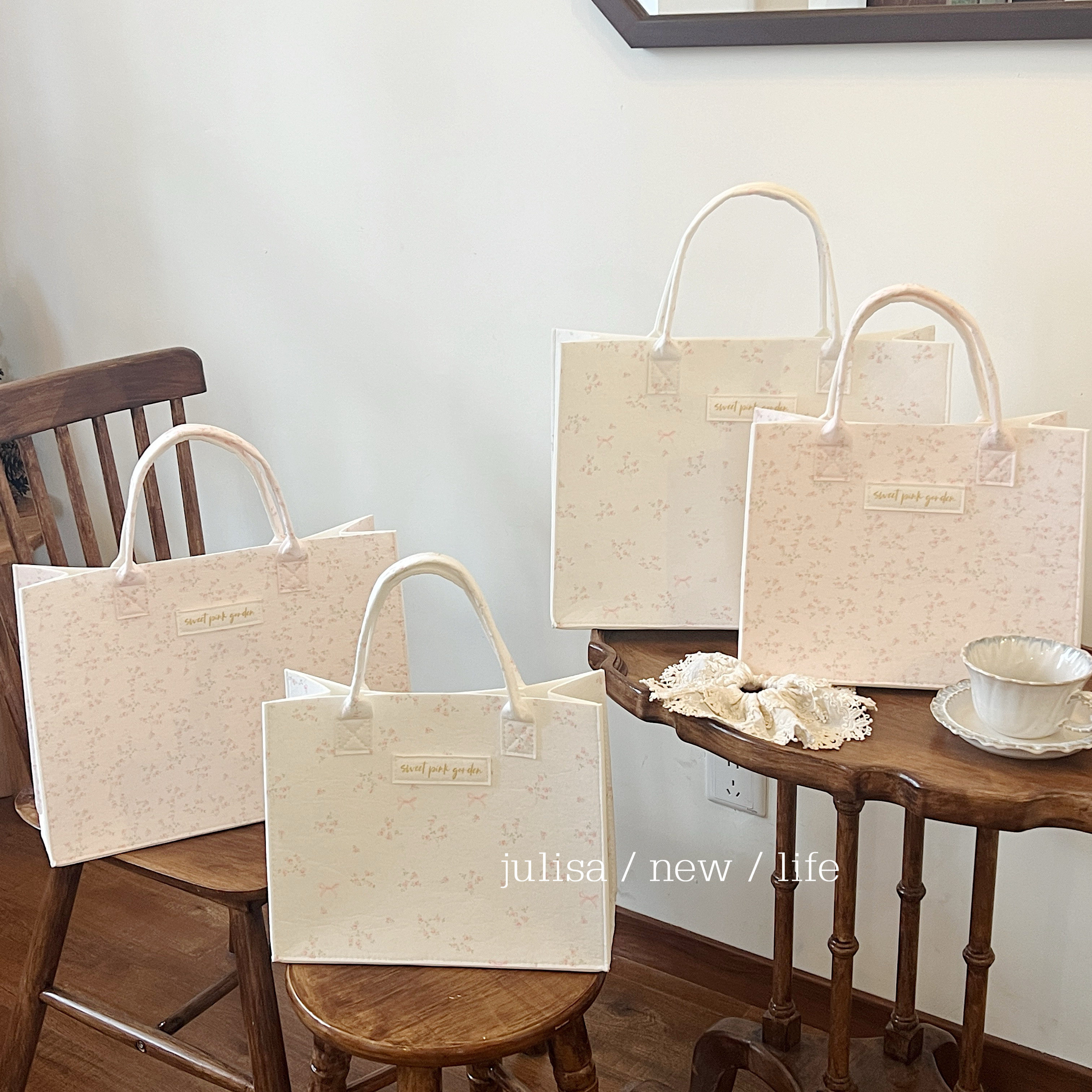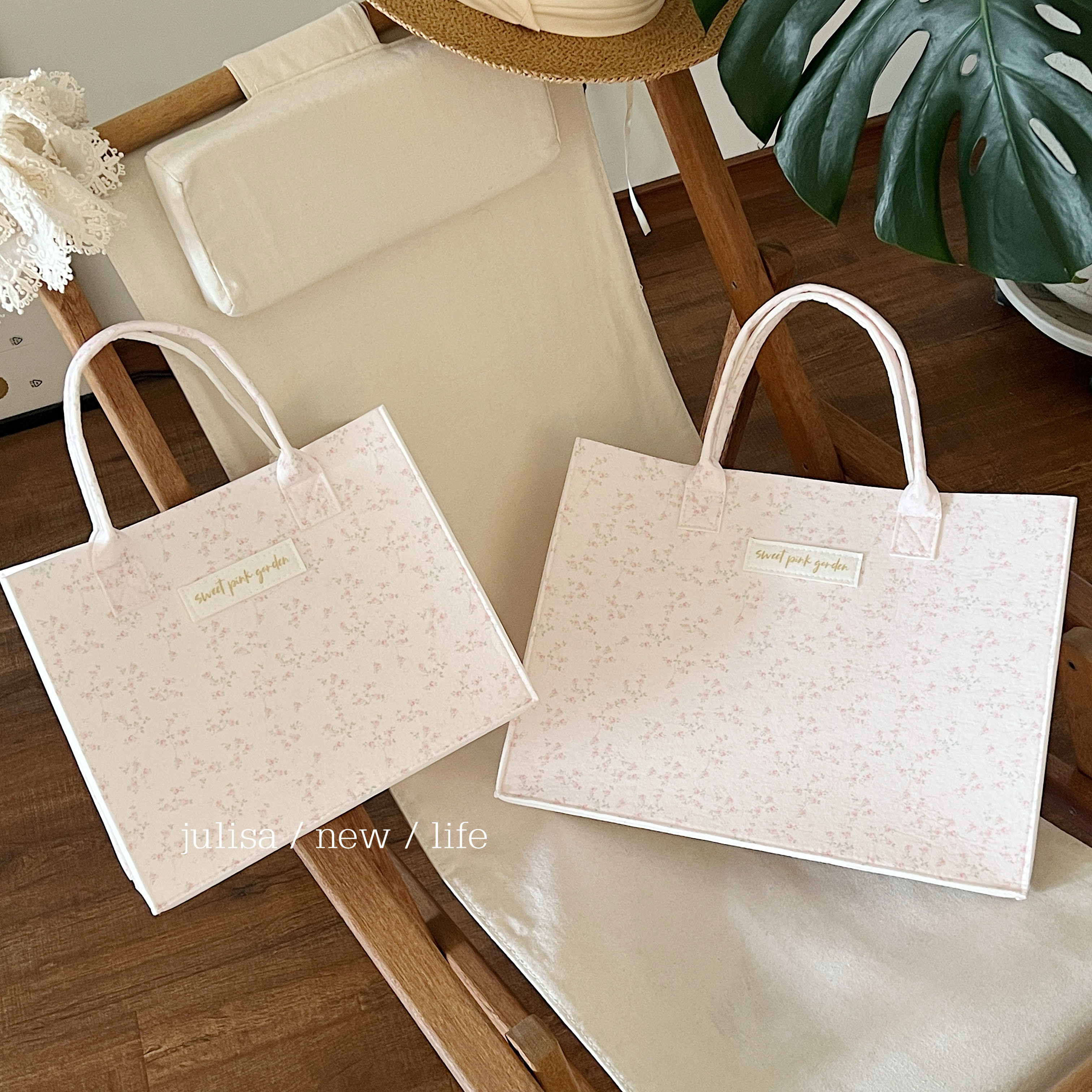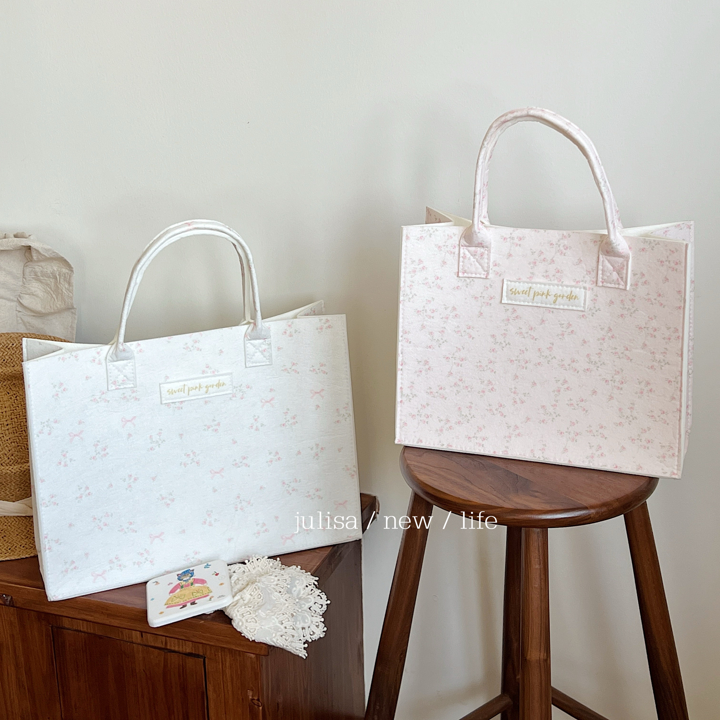 独家原创sweet pink garden蝴蝶结小碎花大容量手提包毛毡托特包