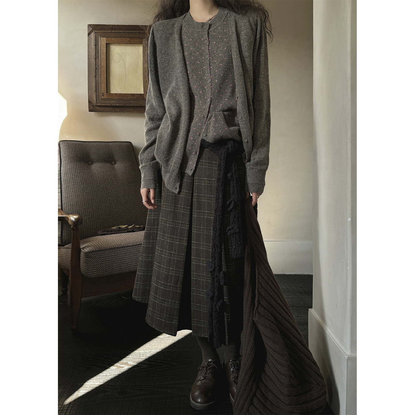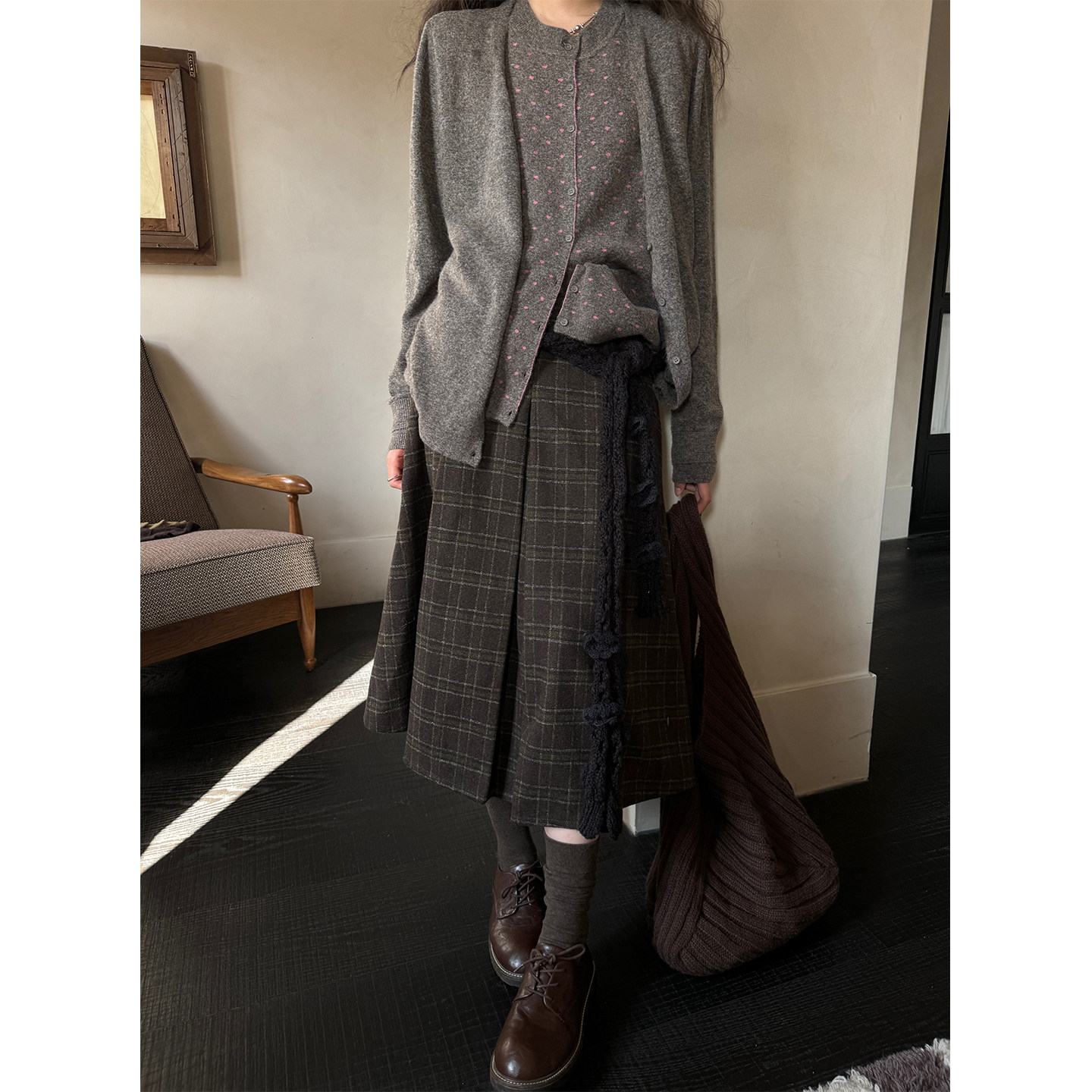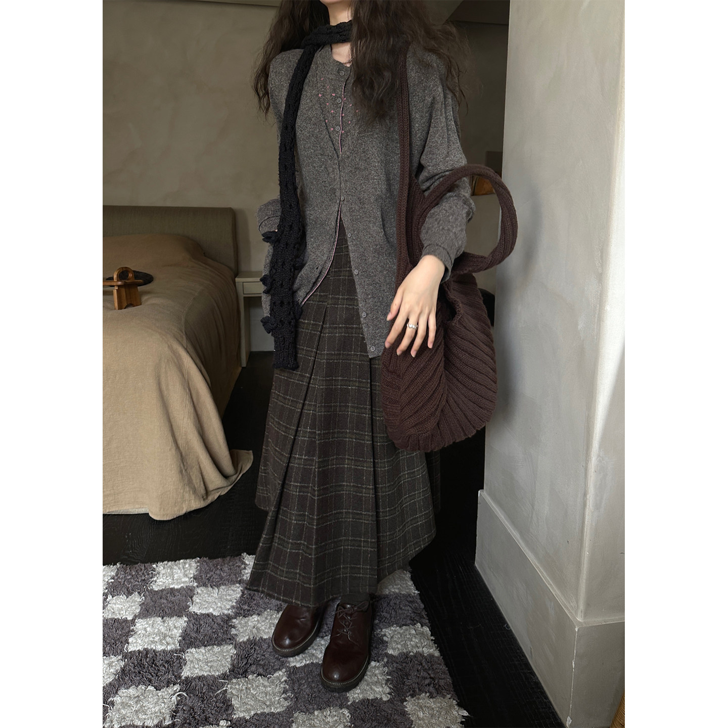 JMWOMEN棕绿格纹毛呢百褶半身裙女冬季加厚宽松复古a字中长款裙子