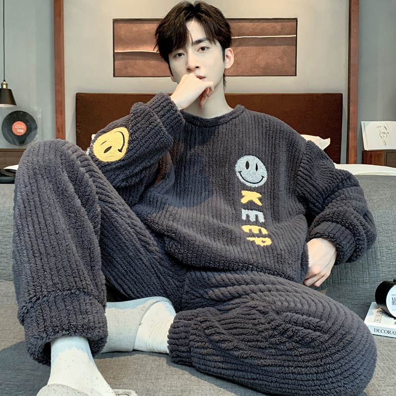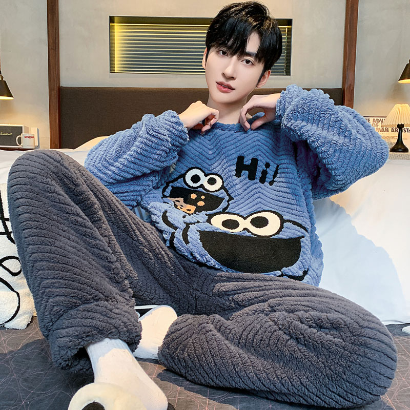 秋冬季加绒加厚男士宽松休闲卡通睡衣中大童可外穿珊瑚绒男孩套装
