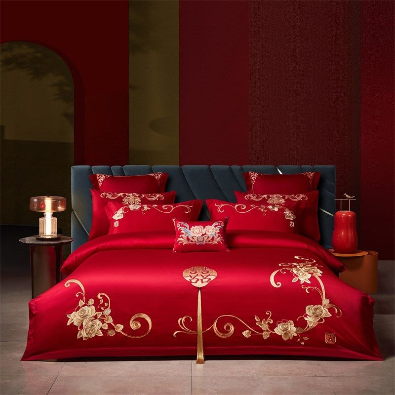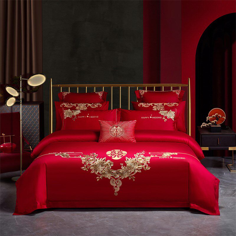婚嫁床上四件套全棉大红色简z约刺绣结婚庆被套床单铺婚房床品