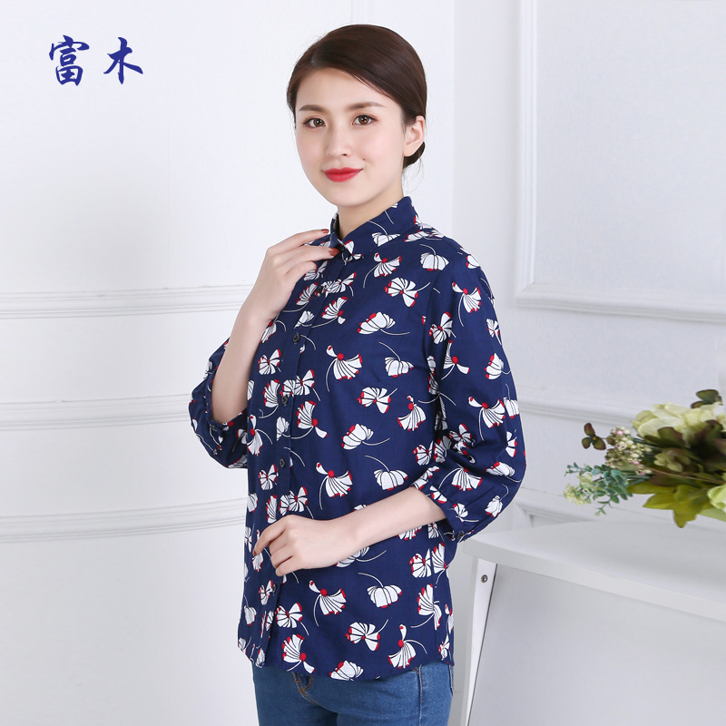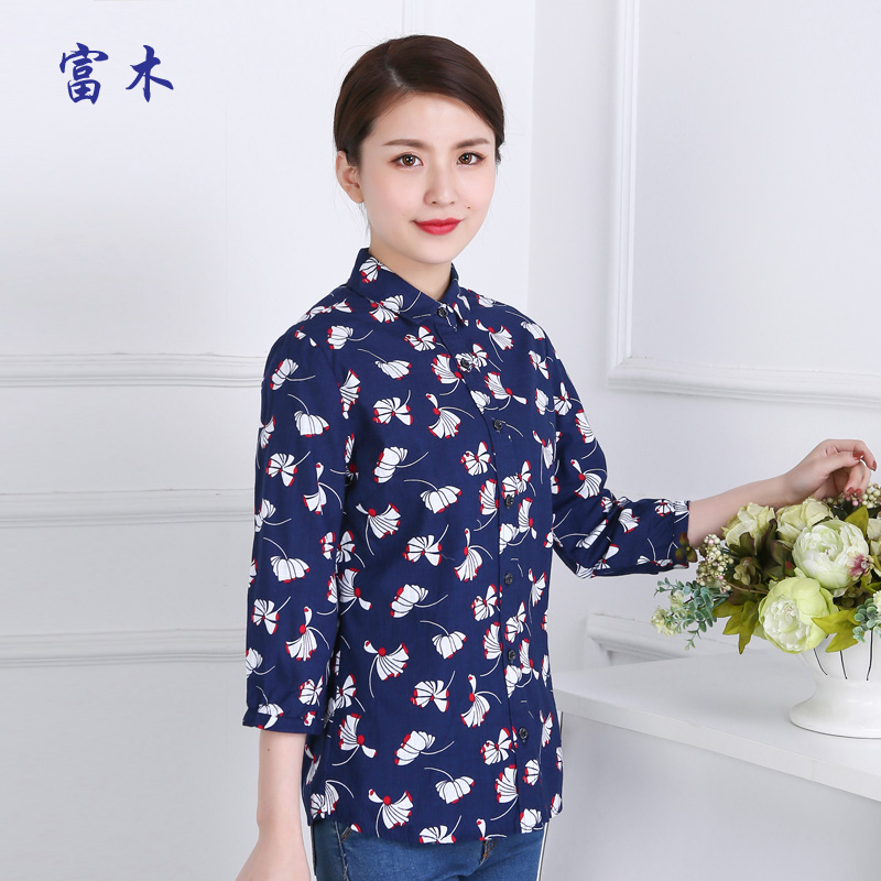 富木女士纯棉花七分袖中老年衬衫