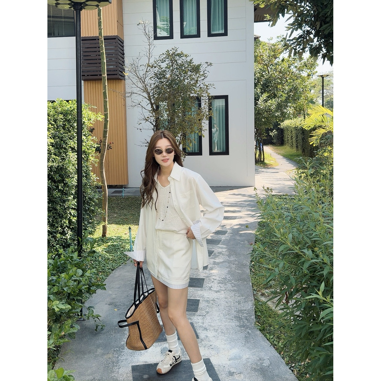 祝喜喜【纯白松弛】春夏新款白色设计师拼接撞色气质显瘦时尚套装